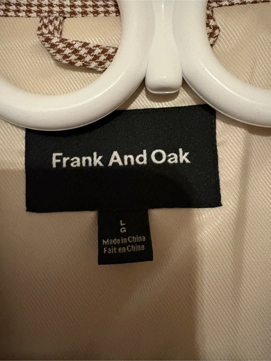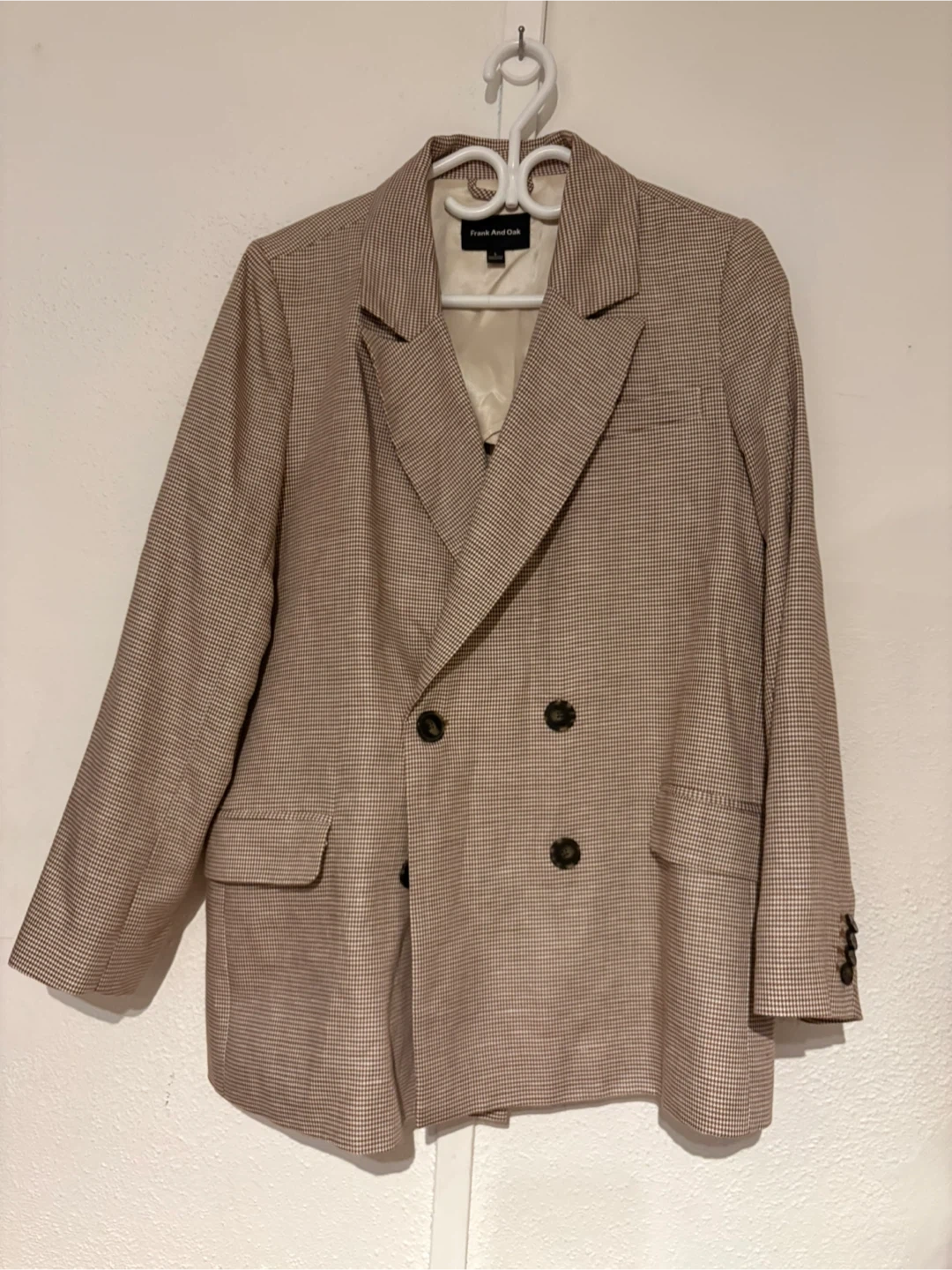 Selling a Frank And Oak blazer in size L. It's a stylish double-breasted blazer with a nice pattern. Perfect for adding a touch of sophistication to your wardrobe!