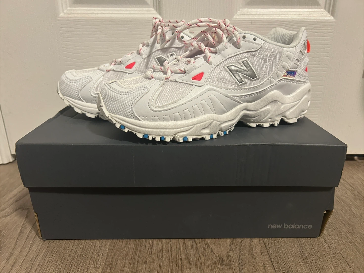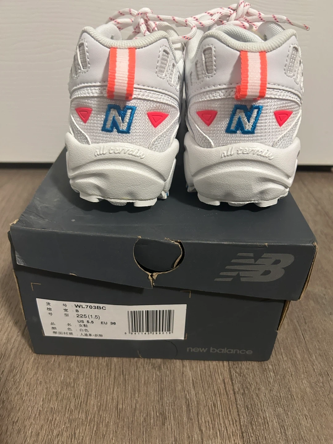 Selling a pair of New Balance 703 sneakers in white! They are brand new and come with the original box. These stylish and comfortable shoes are a size 5.5 (US) or EUR 36. The length is 225. Perfect for everyday wear or hitting the trails!