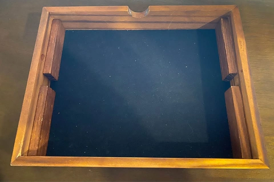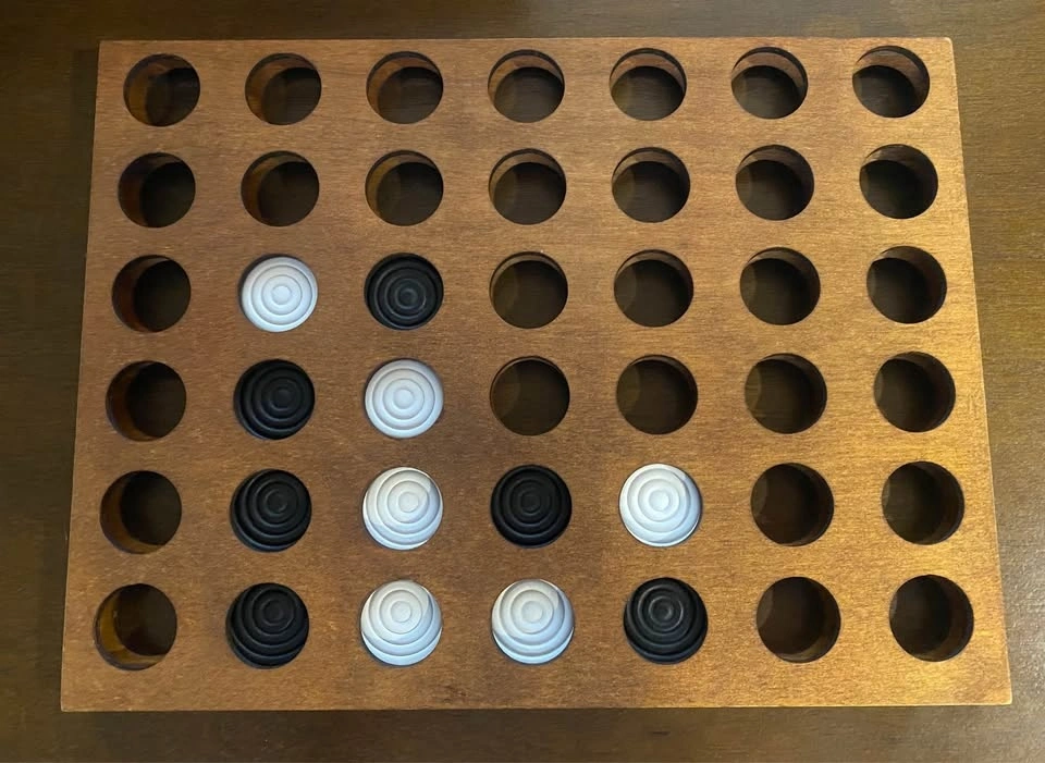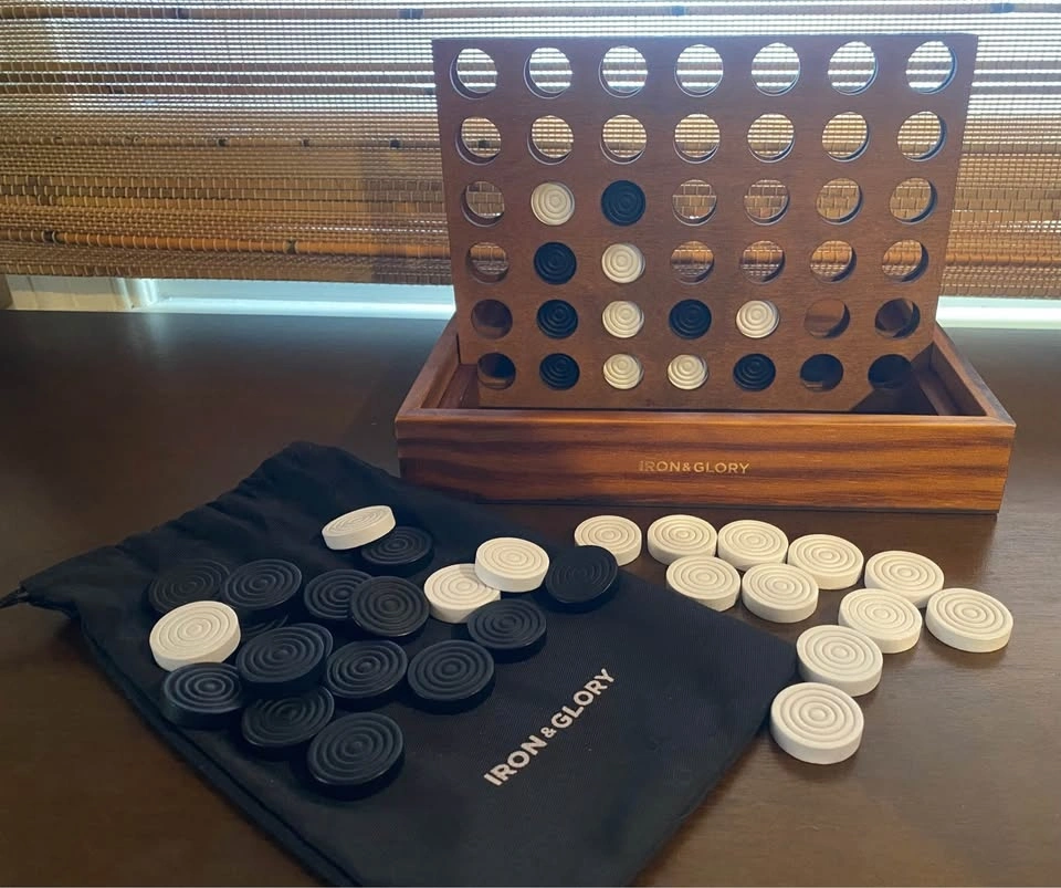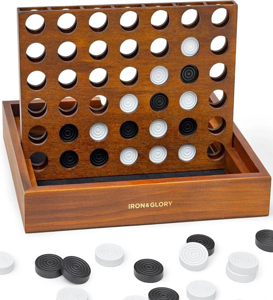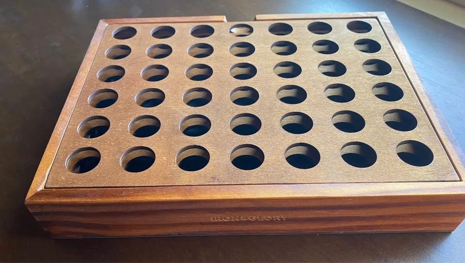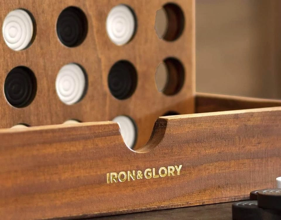 This is an Iron & Glory Line Up (also known as "four-in-a-row") strategy board game. It is a classic two-player strategy game. The set includes a collapsible, solid wood board and 42 wooden playing pieces.