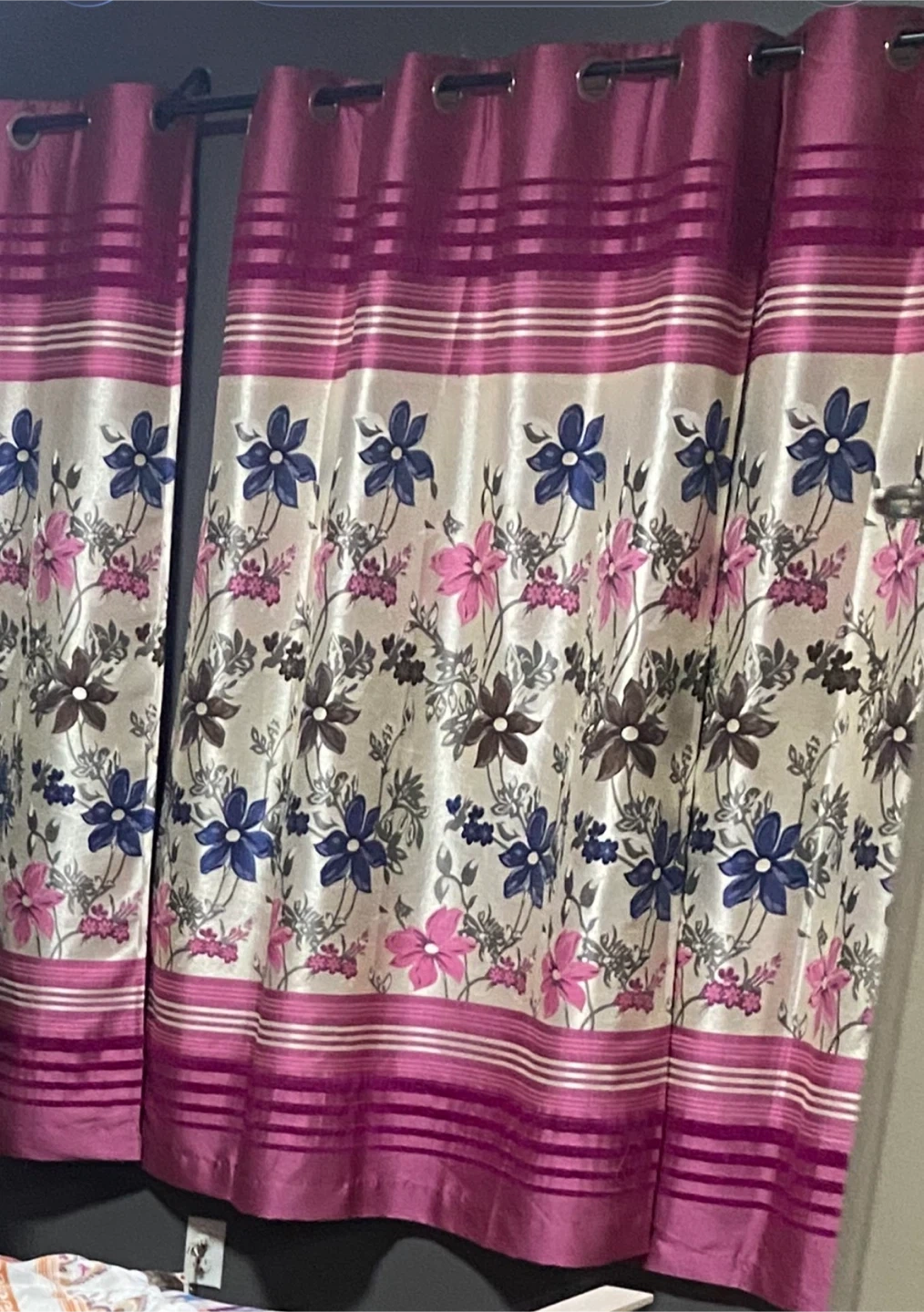 These curtains feature a lovely floral pattern in shades of purple, white, and blue. They're perfect for adding a touch of elegance to any room. The curtains appear to be made of a smooth, possibly satin-like, material. I have total such 3 curtains - thick material - like new