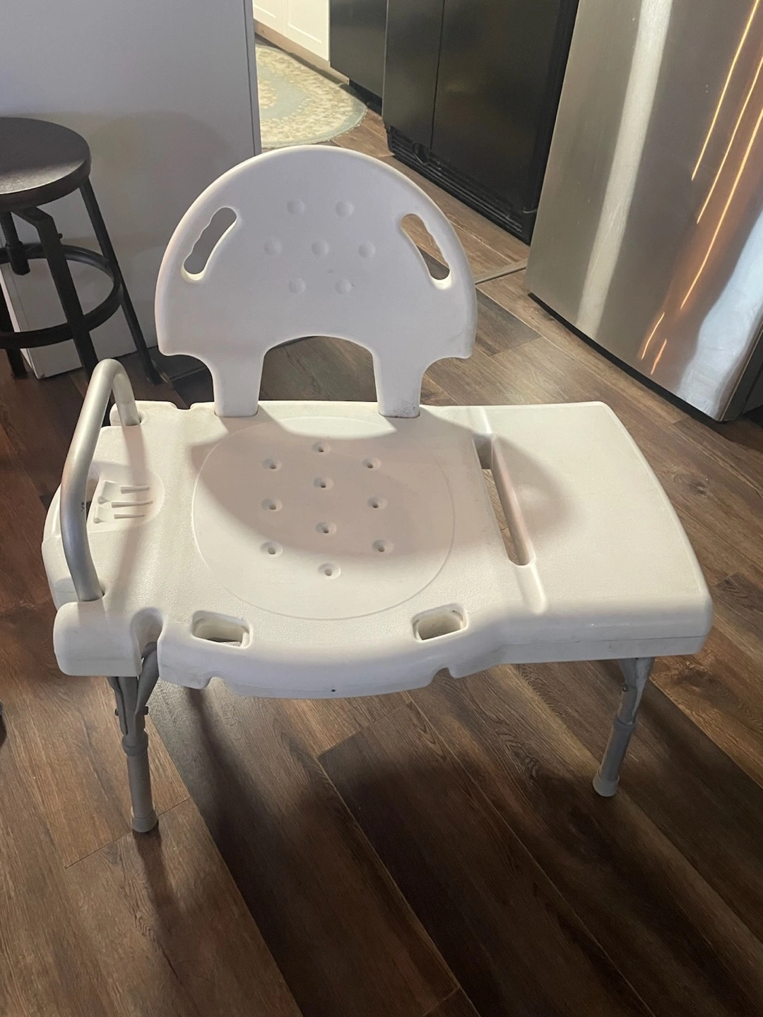 Selling a white bath and shower chair! It has adjustable legs to fit different tub heights and a back for added support. Perfect for anyone needing a little extra help in the bathroom