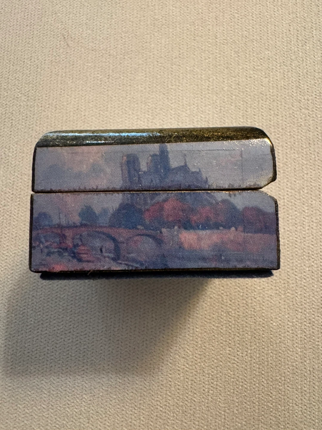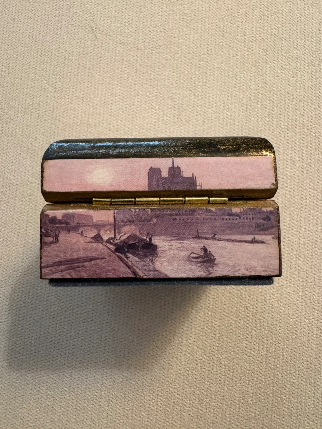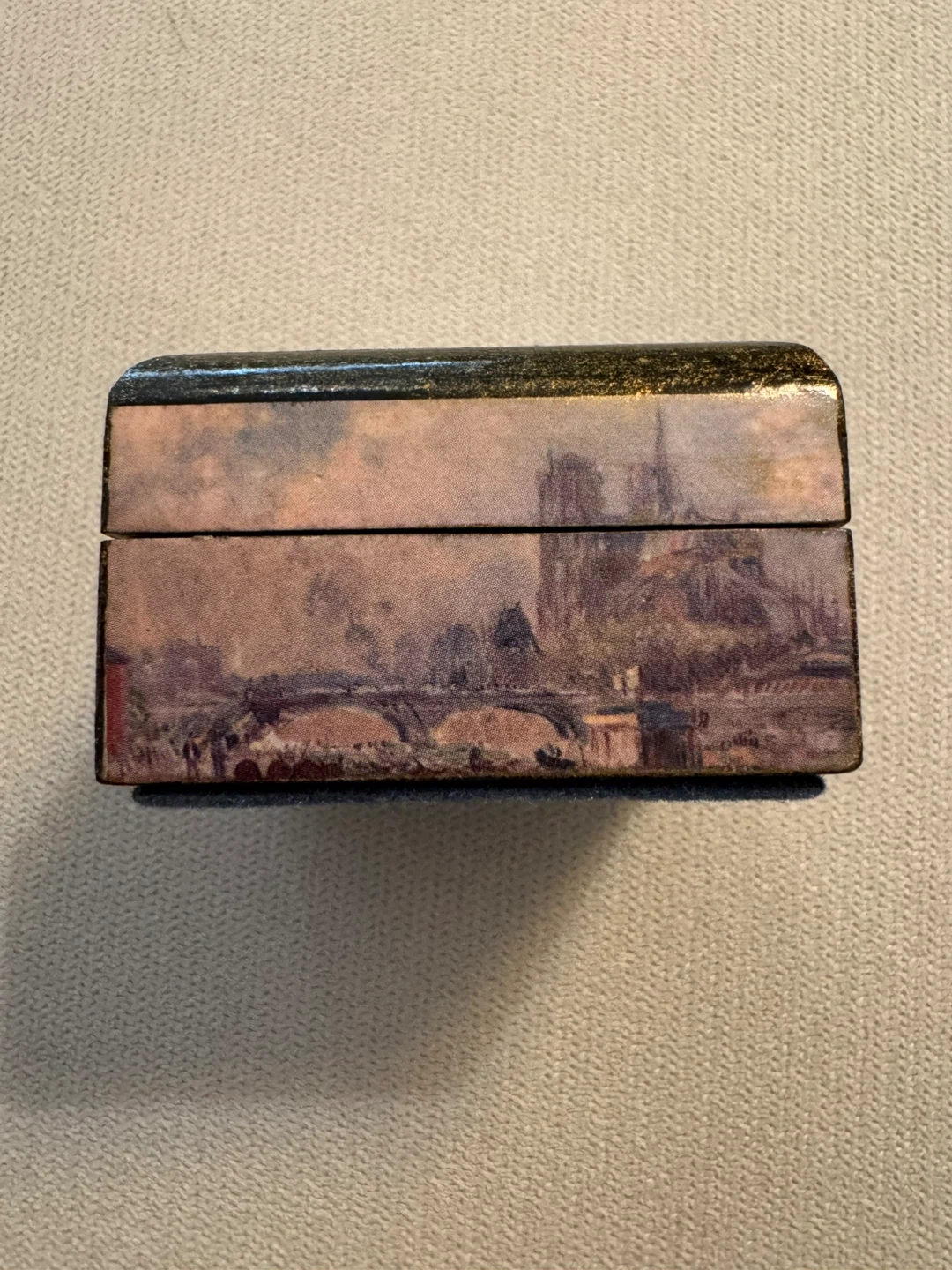Small vintage wooden keepsake box from Paris with illustrated exterior and fabric-lined interior.