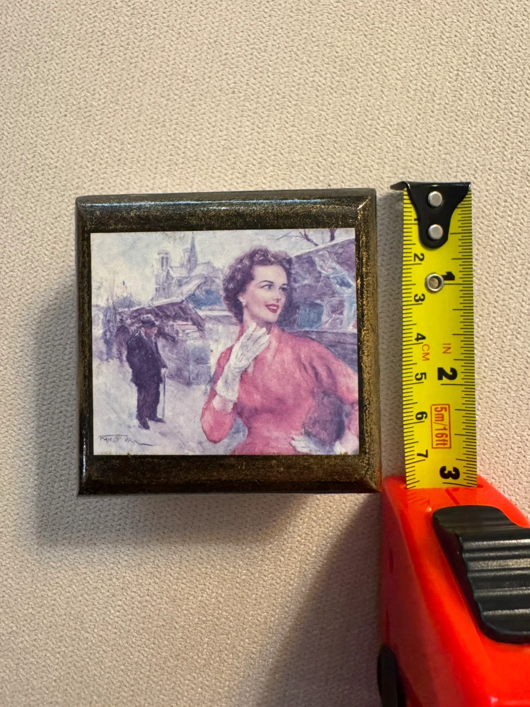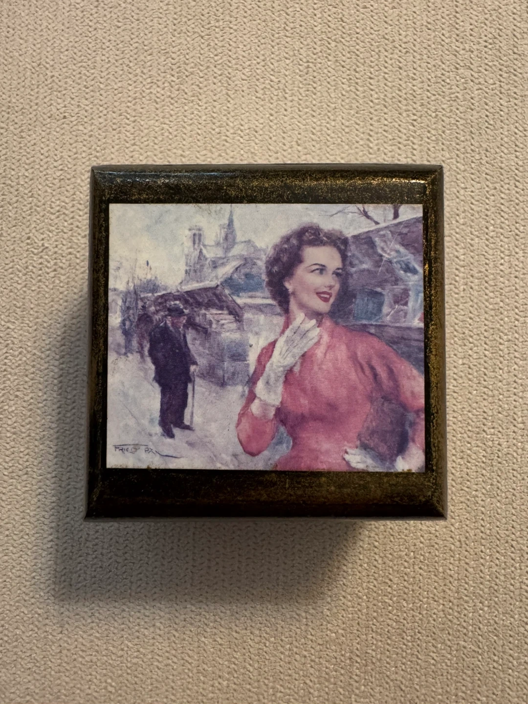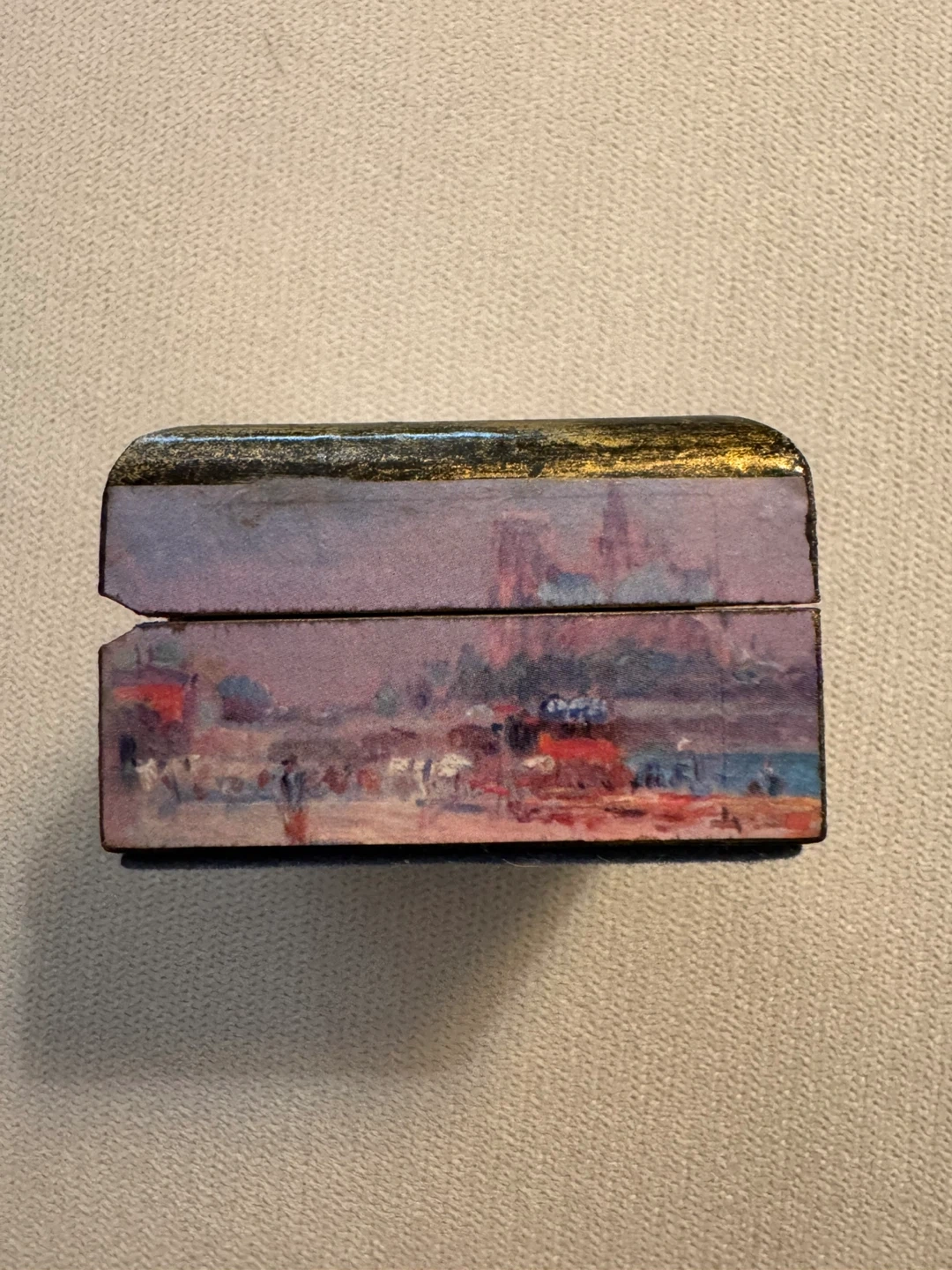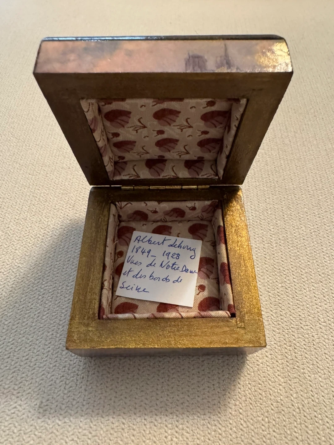 Small vintage wooden keepsake box from Paris with illustrated exterior and fabric-lined interior.