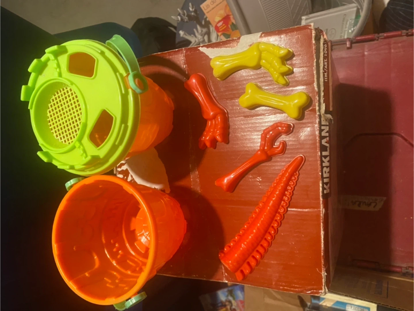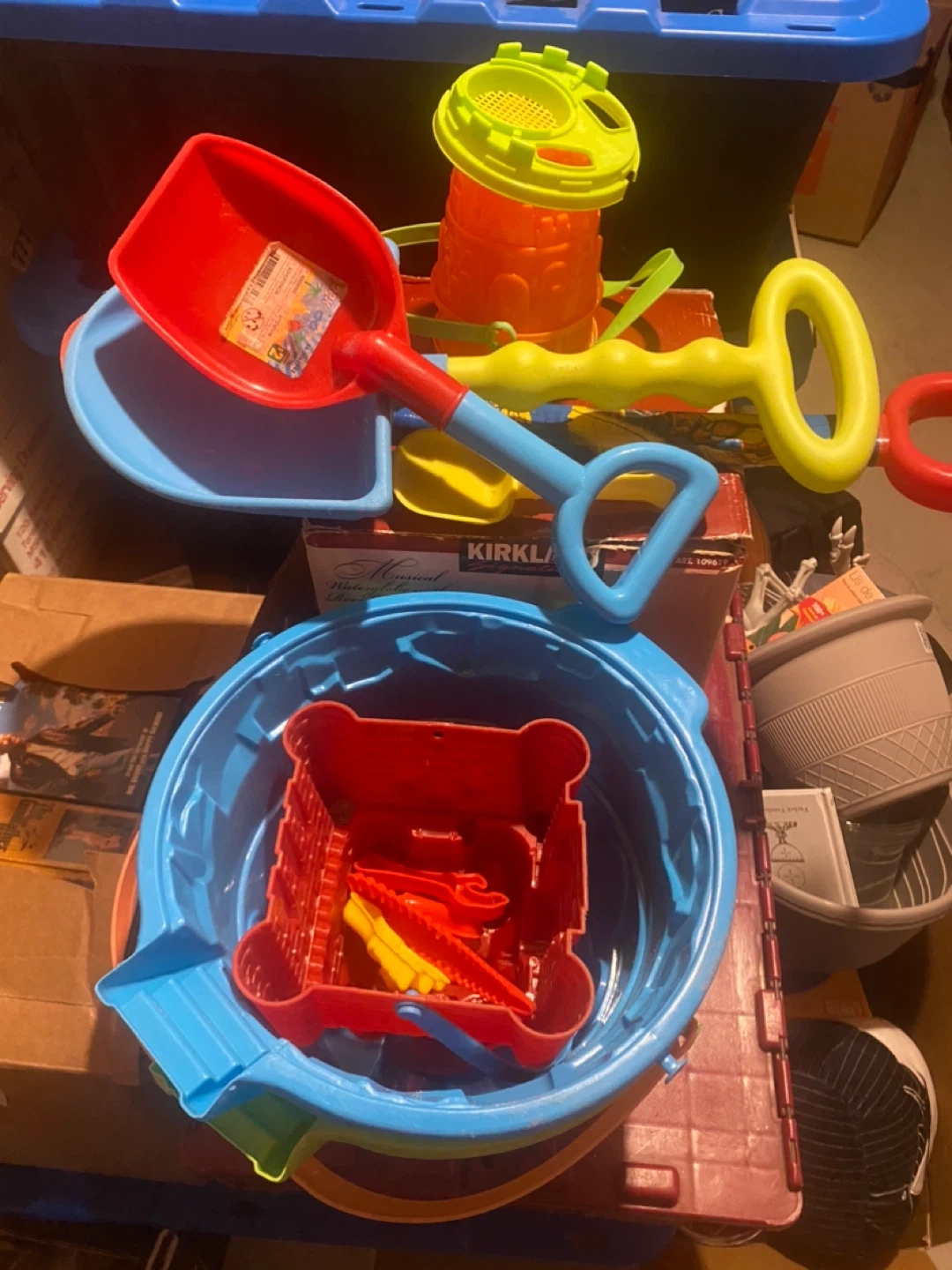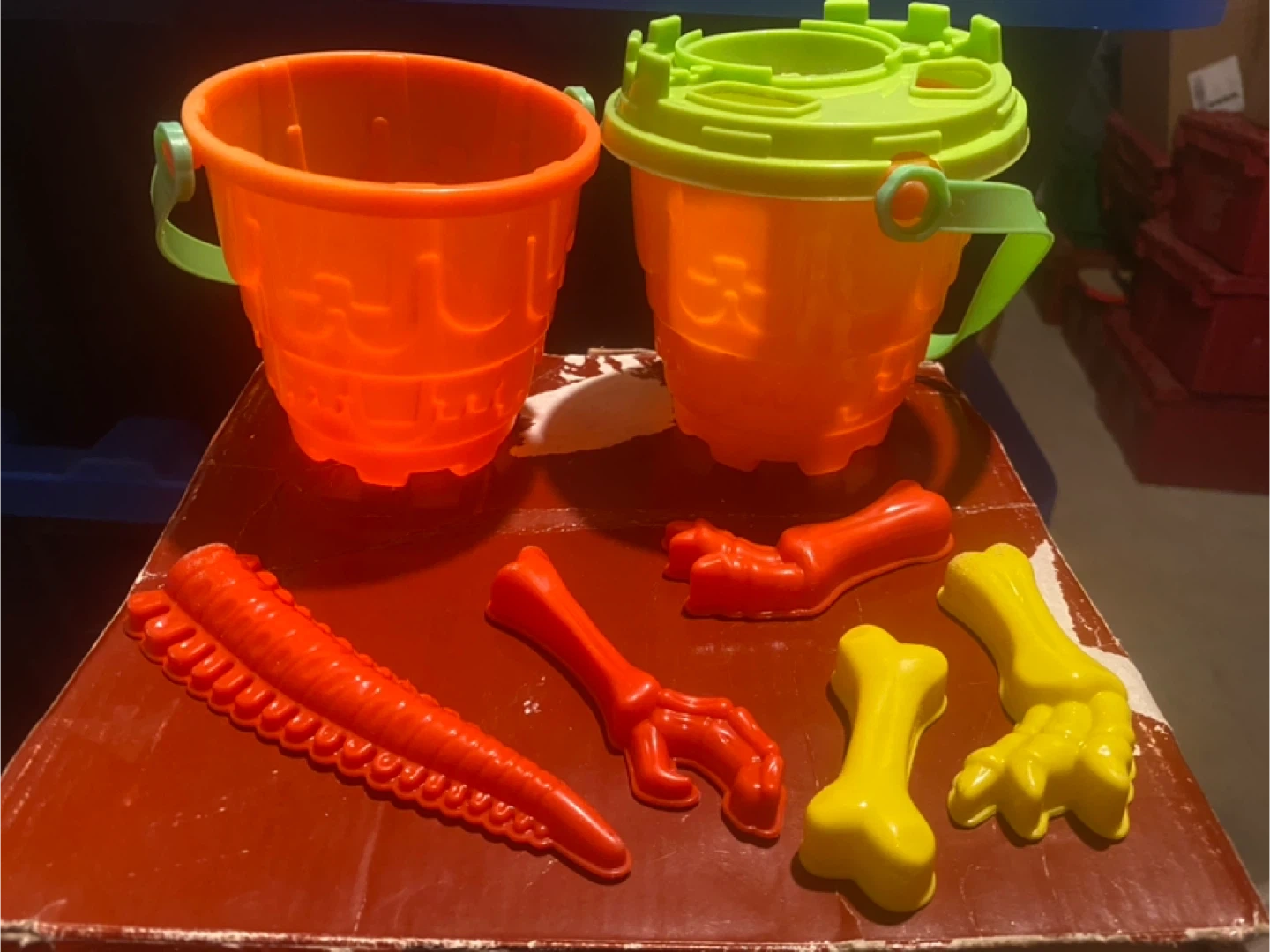 2 large buckets, one medium bucket, 2 small bucks, an array of shovels and some dinosaur bone moulds