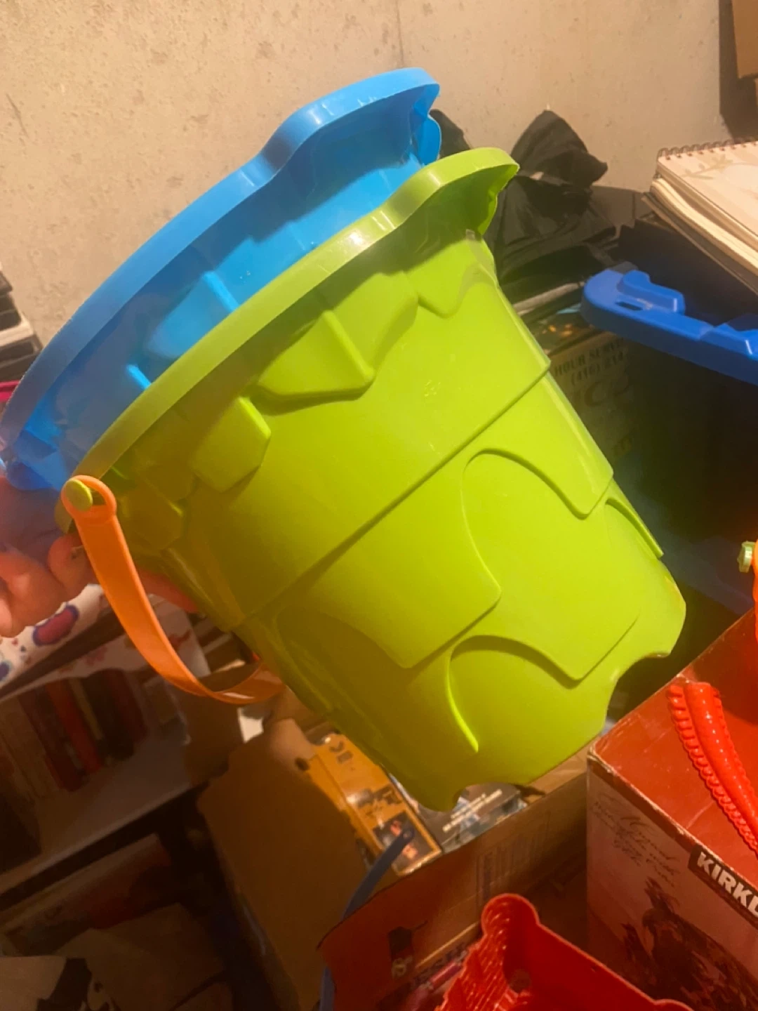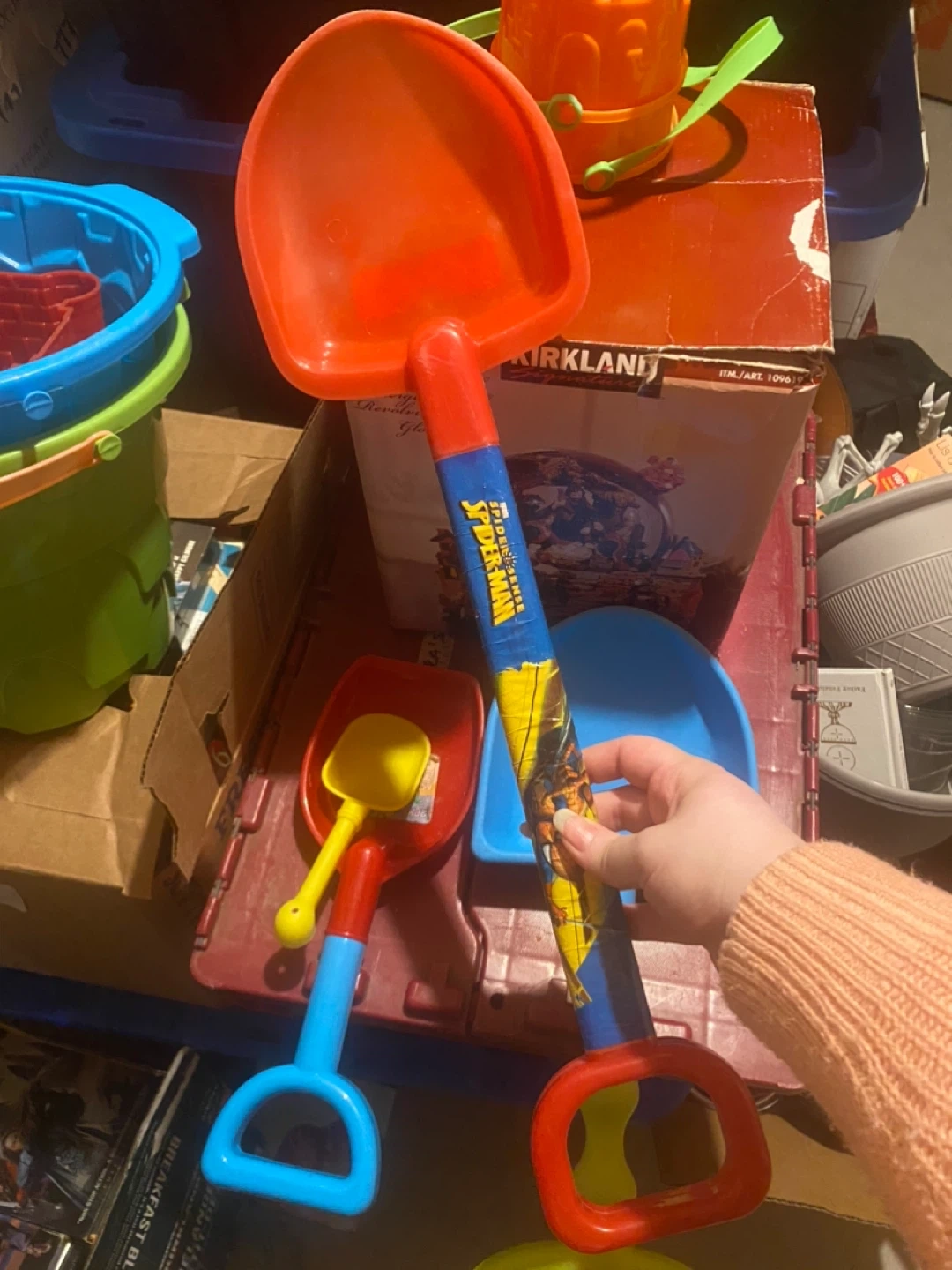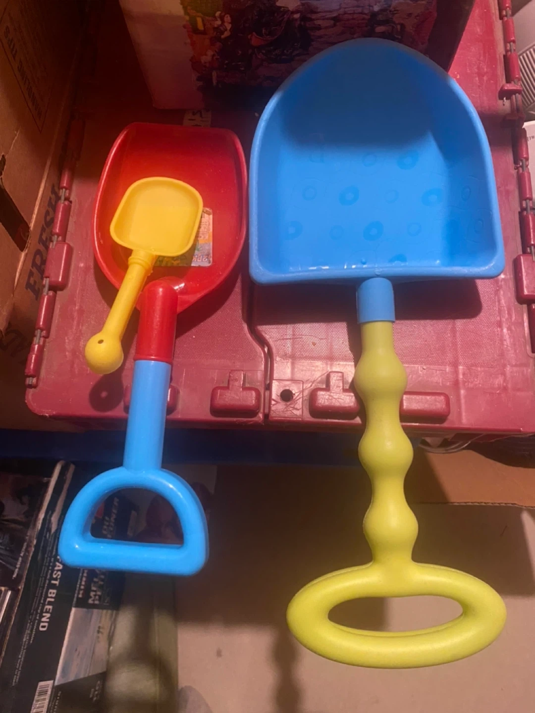2 large buckets, one medium bucket, 2 small bucks, an array of shovels and some dinosaur bone moulds
