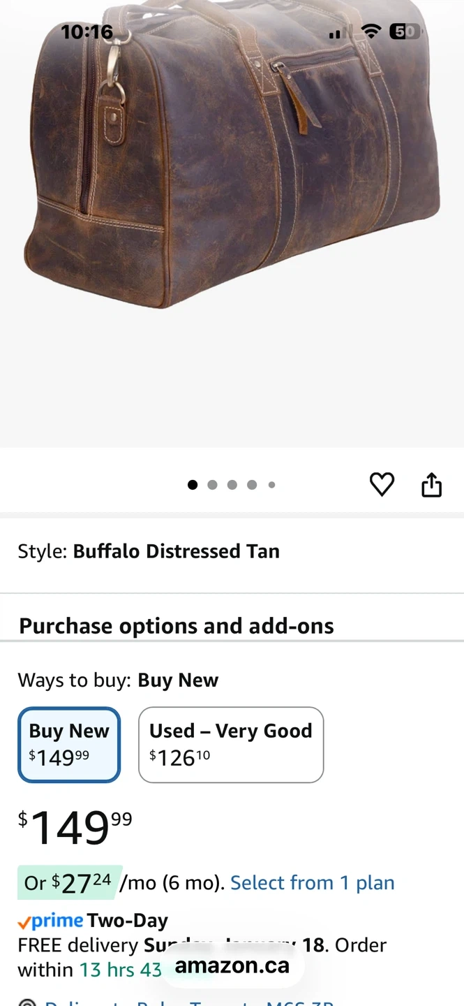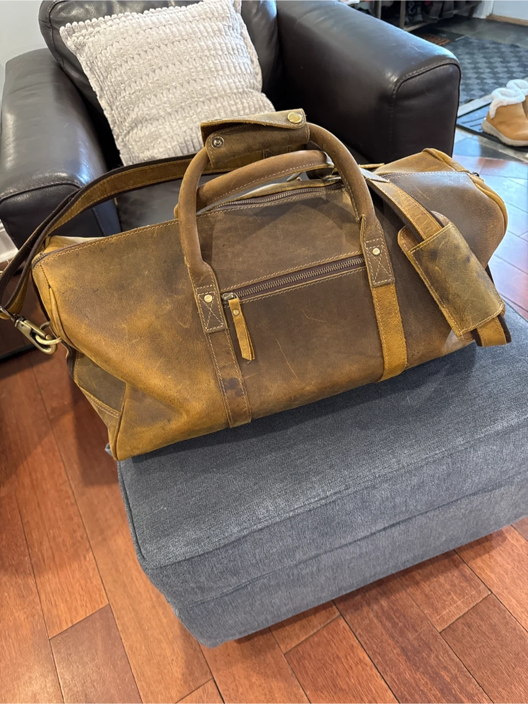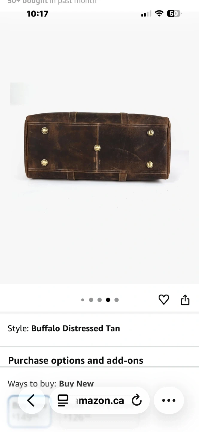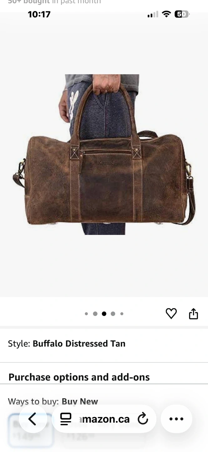 Classic men's weekend bag in a Buffalo Distressed Tan leather! It's perfect for weekend getaways or as a carry-on. The bag is made with high-quality leather and has a unique, vintage look that will turn heads. It's NEW condition and ready for its next adventure. Bought for husband (140$) which he feels is too heavy compared to ugly 1980s gym bag ๐. Bag was never used.