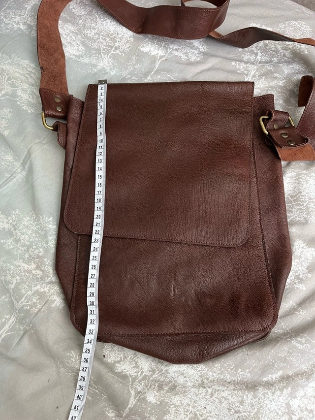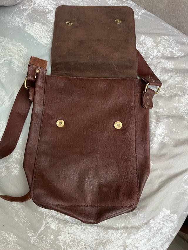 I'm selling a very stylish brown leather bag. This bag has a shoulder strap and a snap closure, making it both fashionable and functional. The bag is used, but it is in good condition and ready for a new home. Here are some additional details: