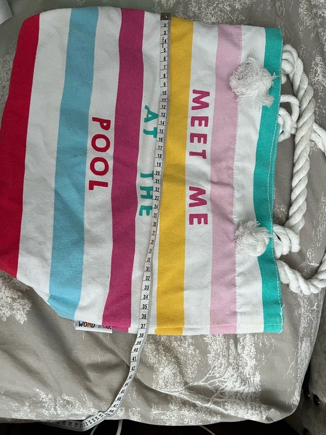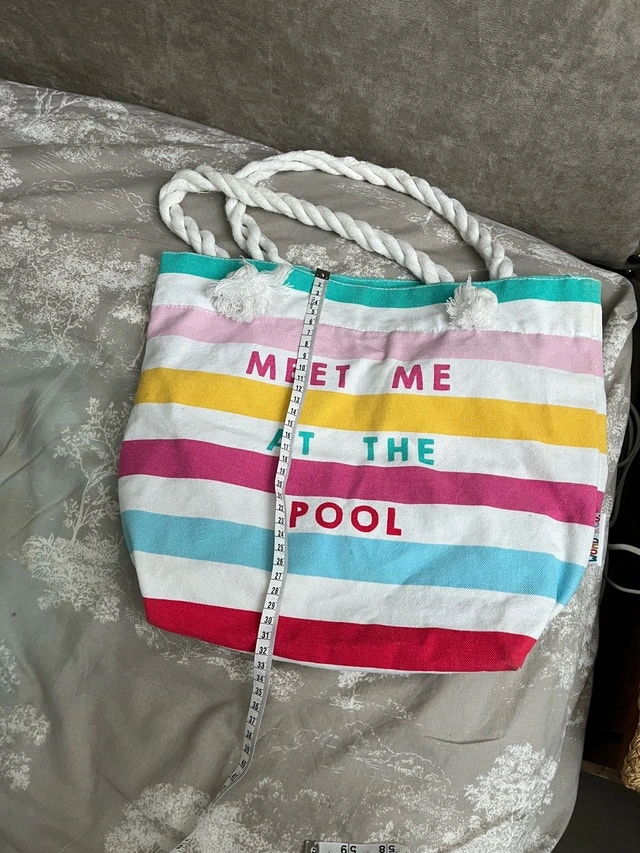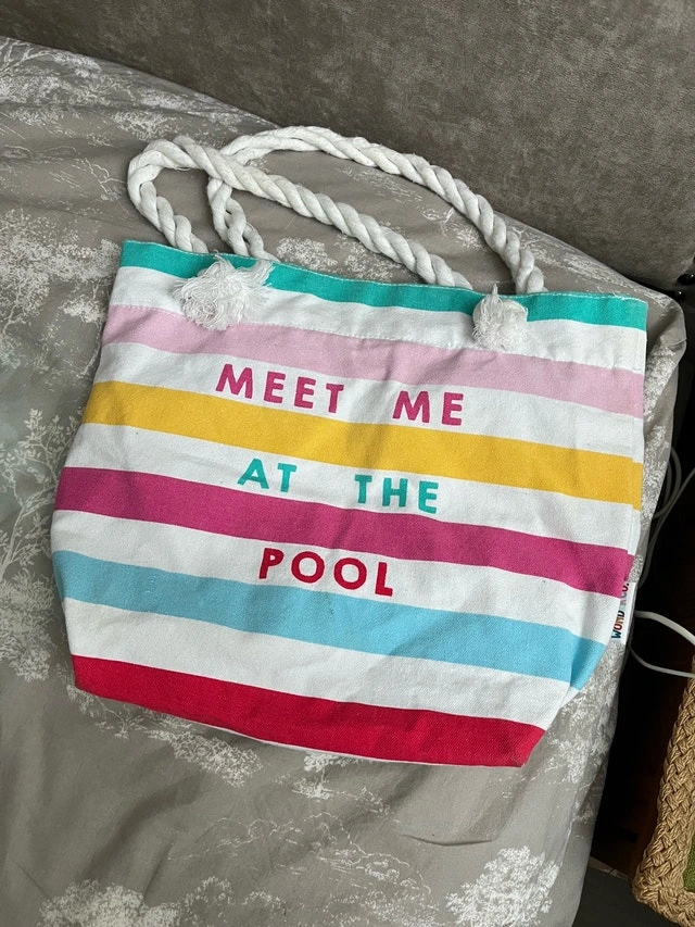 Add a splash of summer fun to your beach days with this colourful striped tote bag! Featuring sturdy rope handles and the playful words 'Meet Me At The Pool', it's perfect for carrying your essentials. Please note, it's in used condition and ready for new adventures. If the ad is up, it's still available!