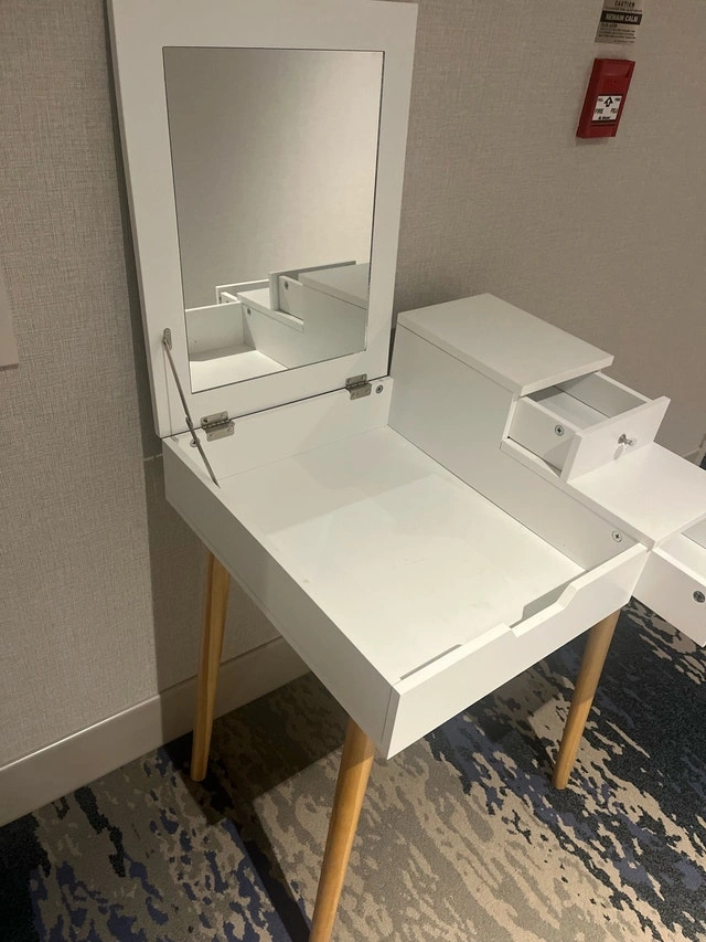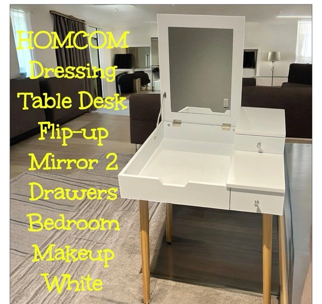 I am selling a HOMCOM dressing table desk with a flip-up mirror. This makeup vanity features two drawers and is perfect for a bedroom setup. It's in used, good condition.