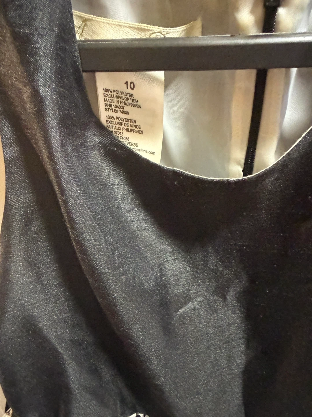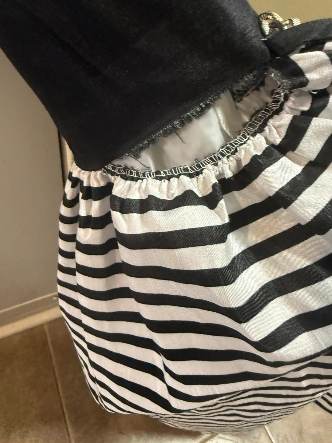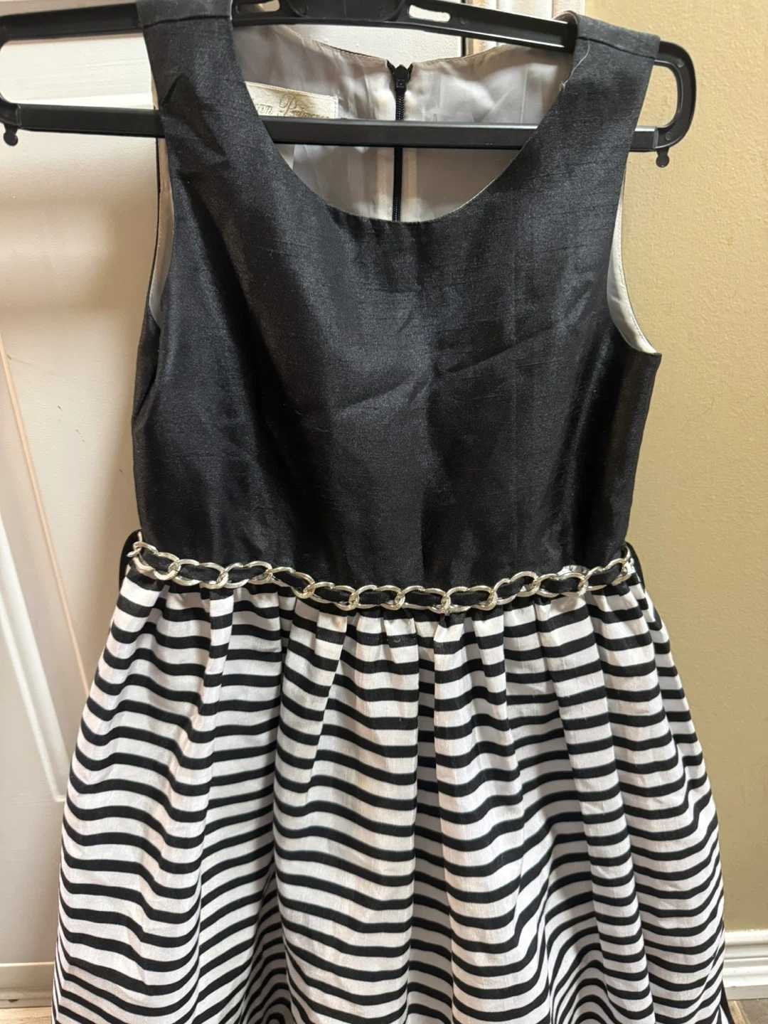 A cute dress for girls, size 10! It features a black top and a black and white striped bottom. The material is 100% polyester, exclusive of trim