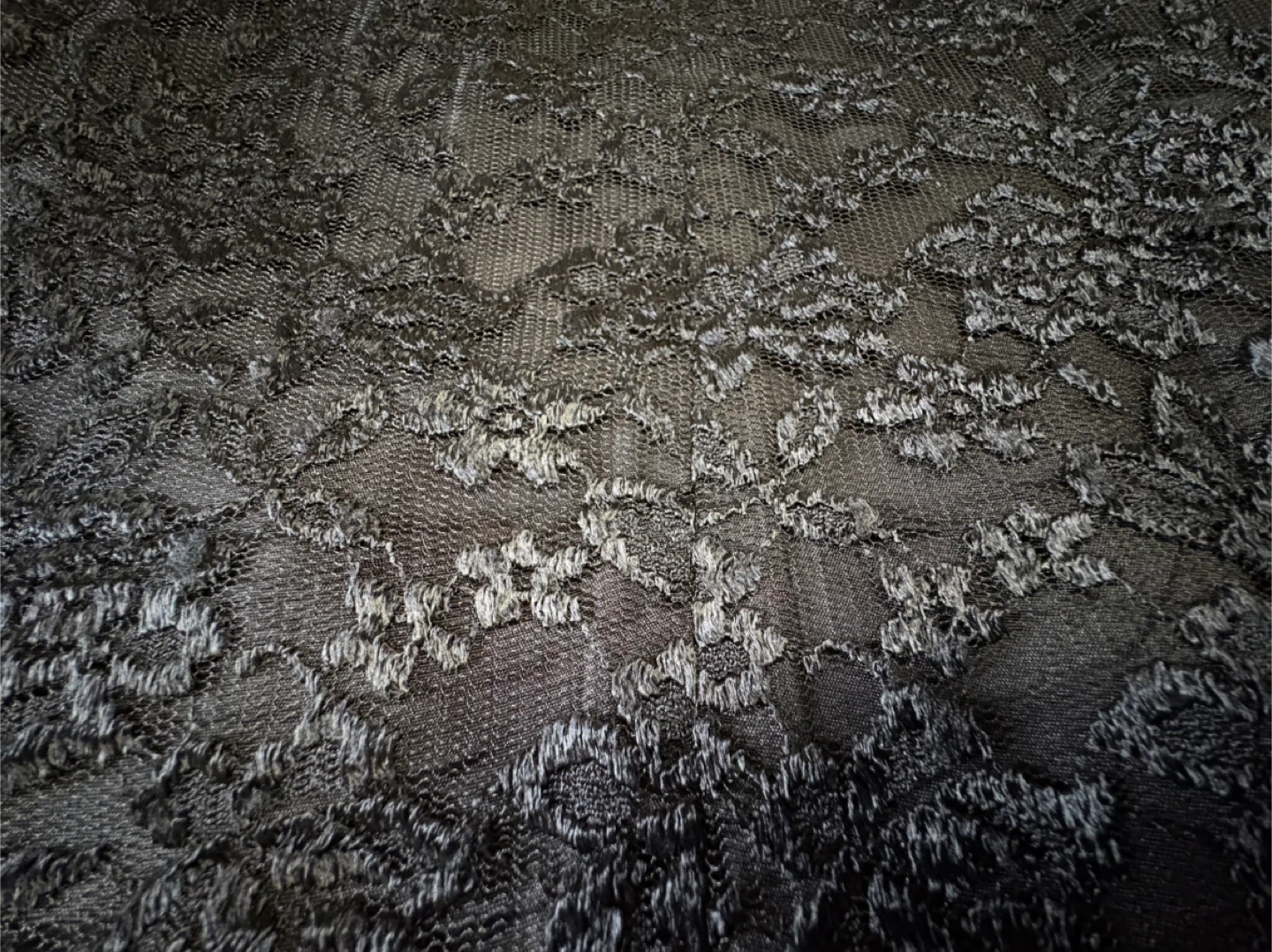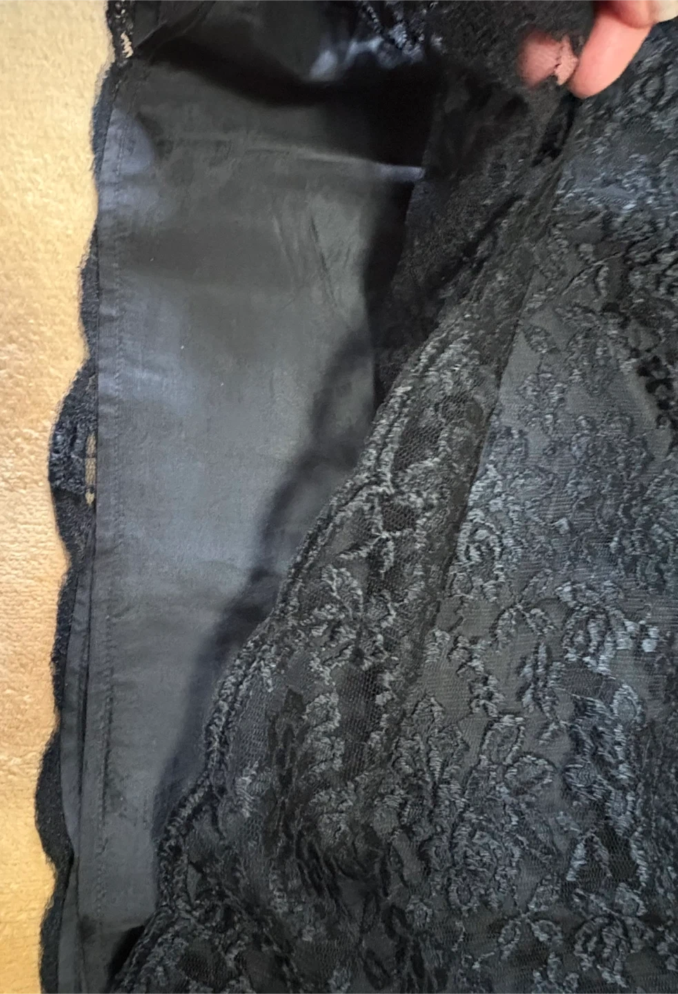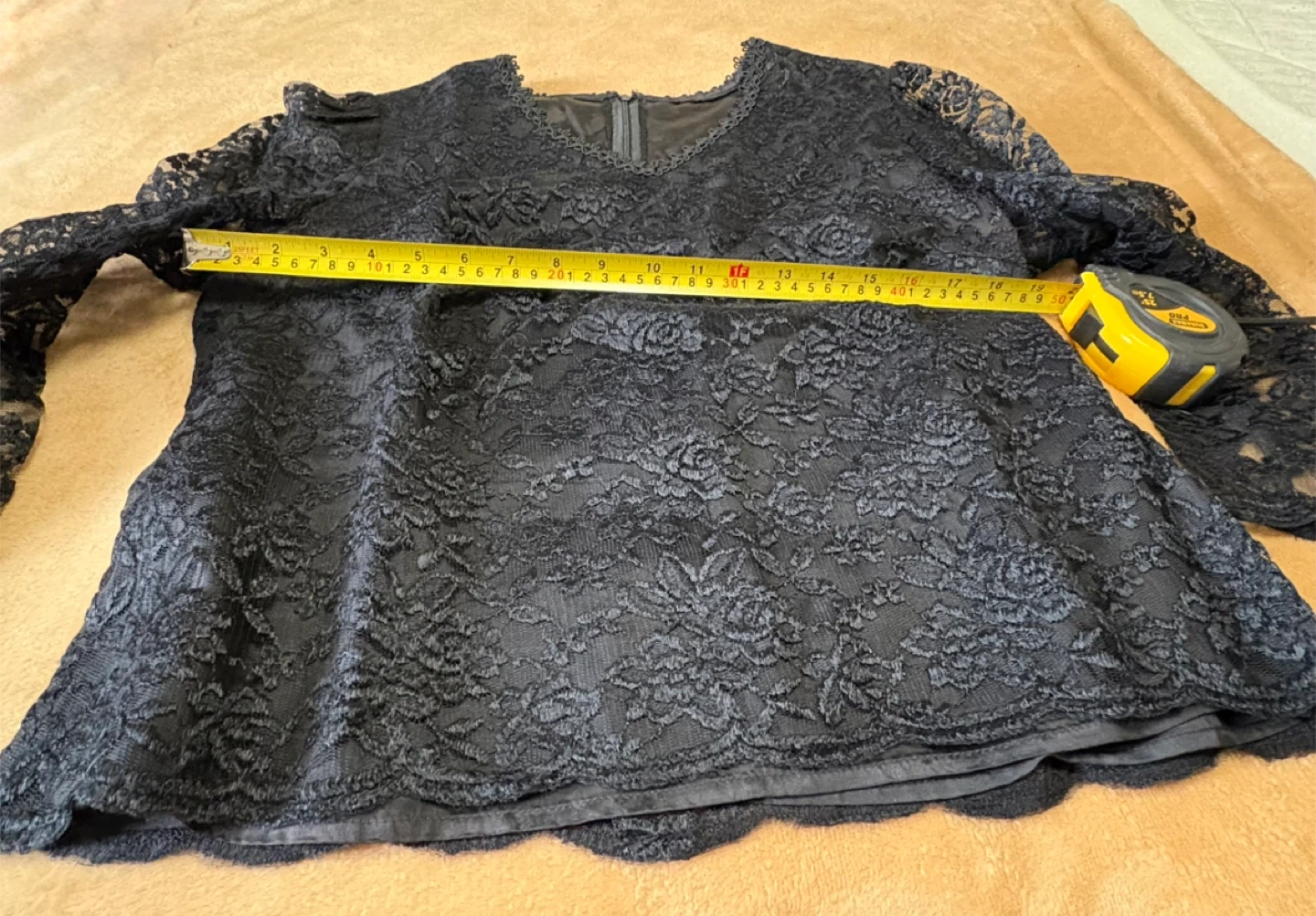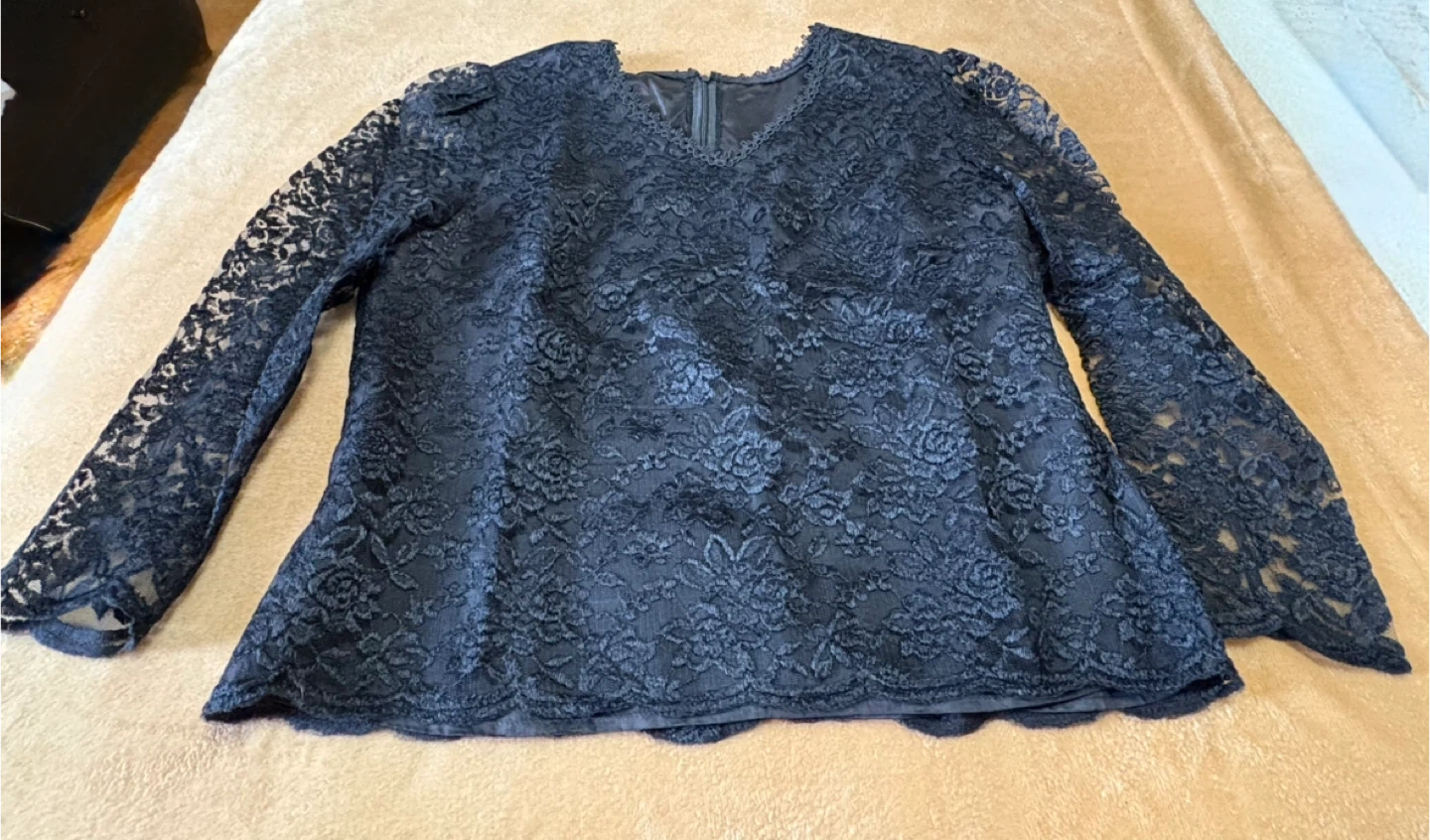 This is a beautiful, pre-owned black lace blouse, perfect for adding a touch of elegance to any outfit. It features long, bell sleeves and is fully lined with the exception of the sleeves.