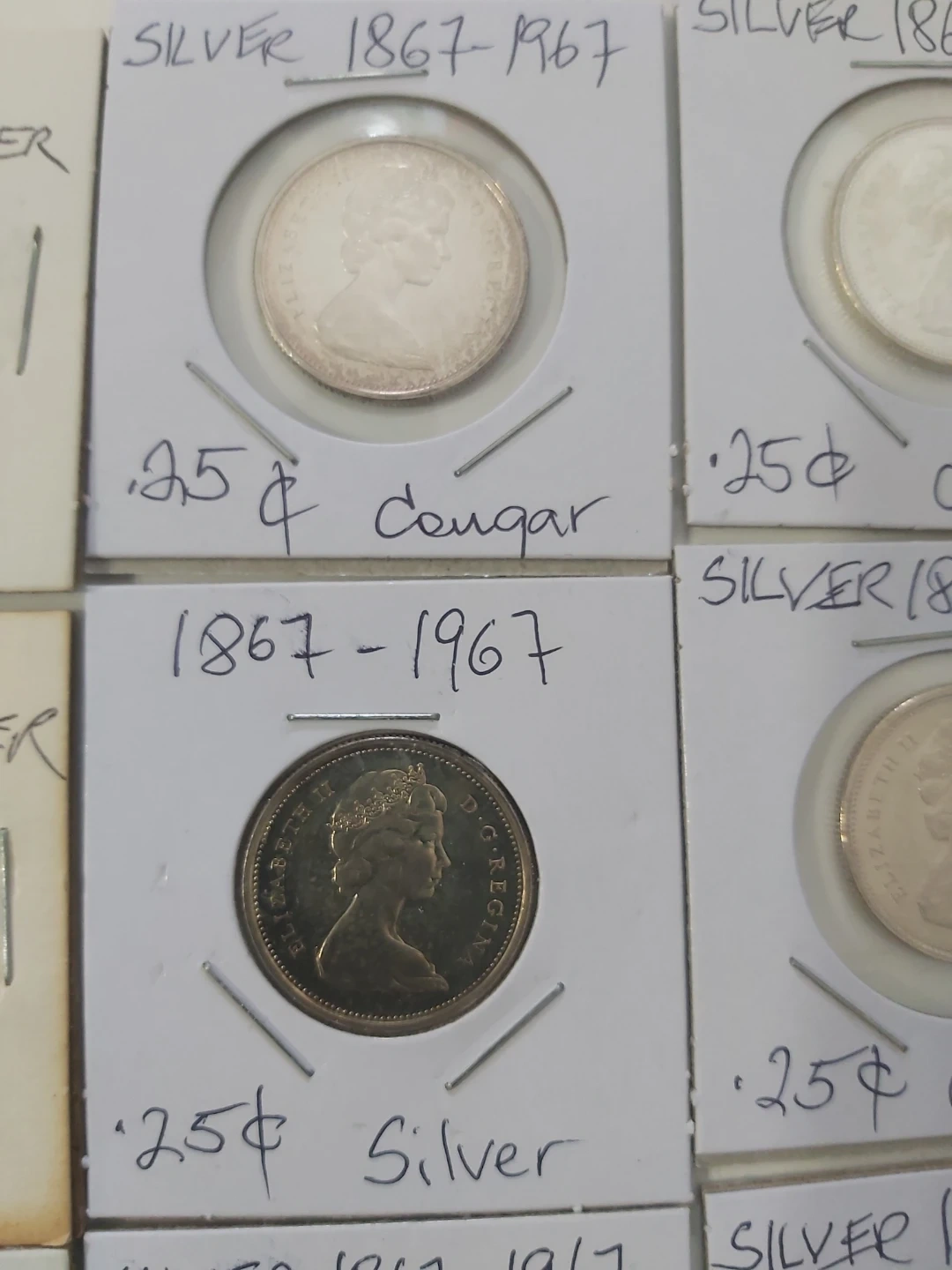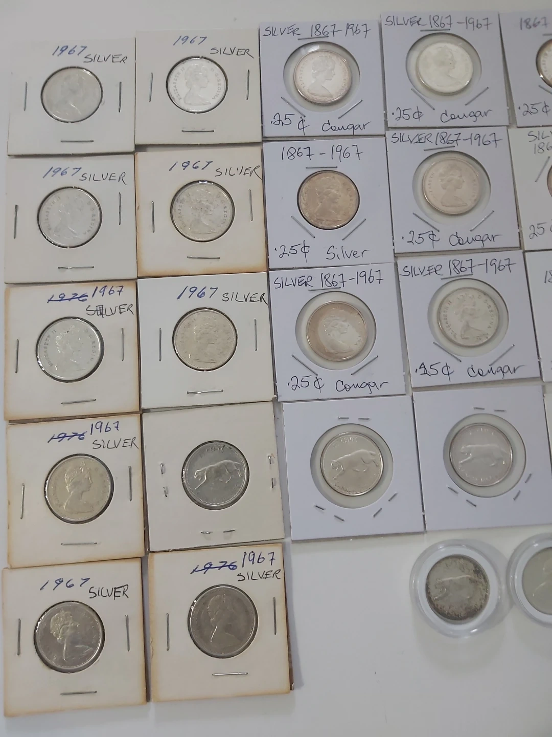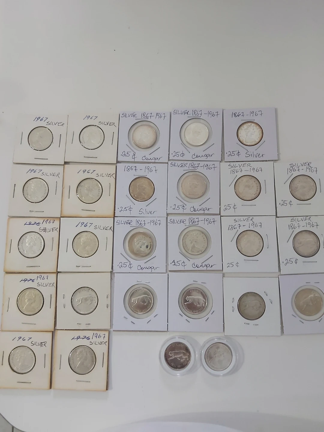 Selling a collection of vintage Canadian silver coins. These are 25-cent pieces from 1867-1967. They feature the Queen and a cougar design. Perfect for collectors of Canadaian History Collection, plus it's Silver content.