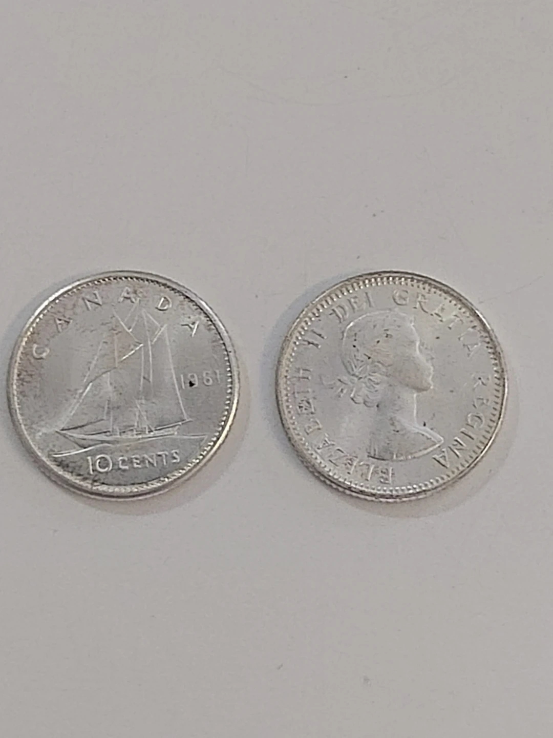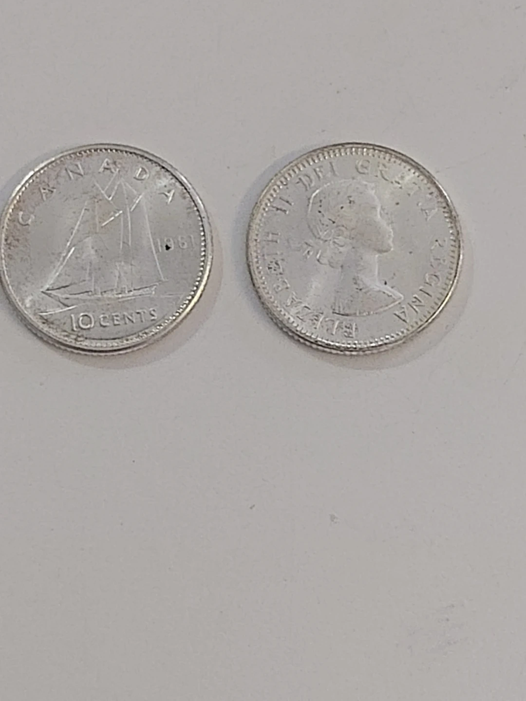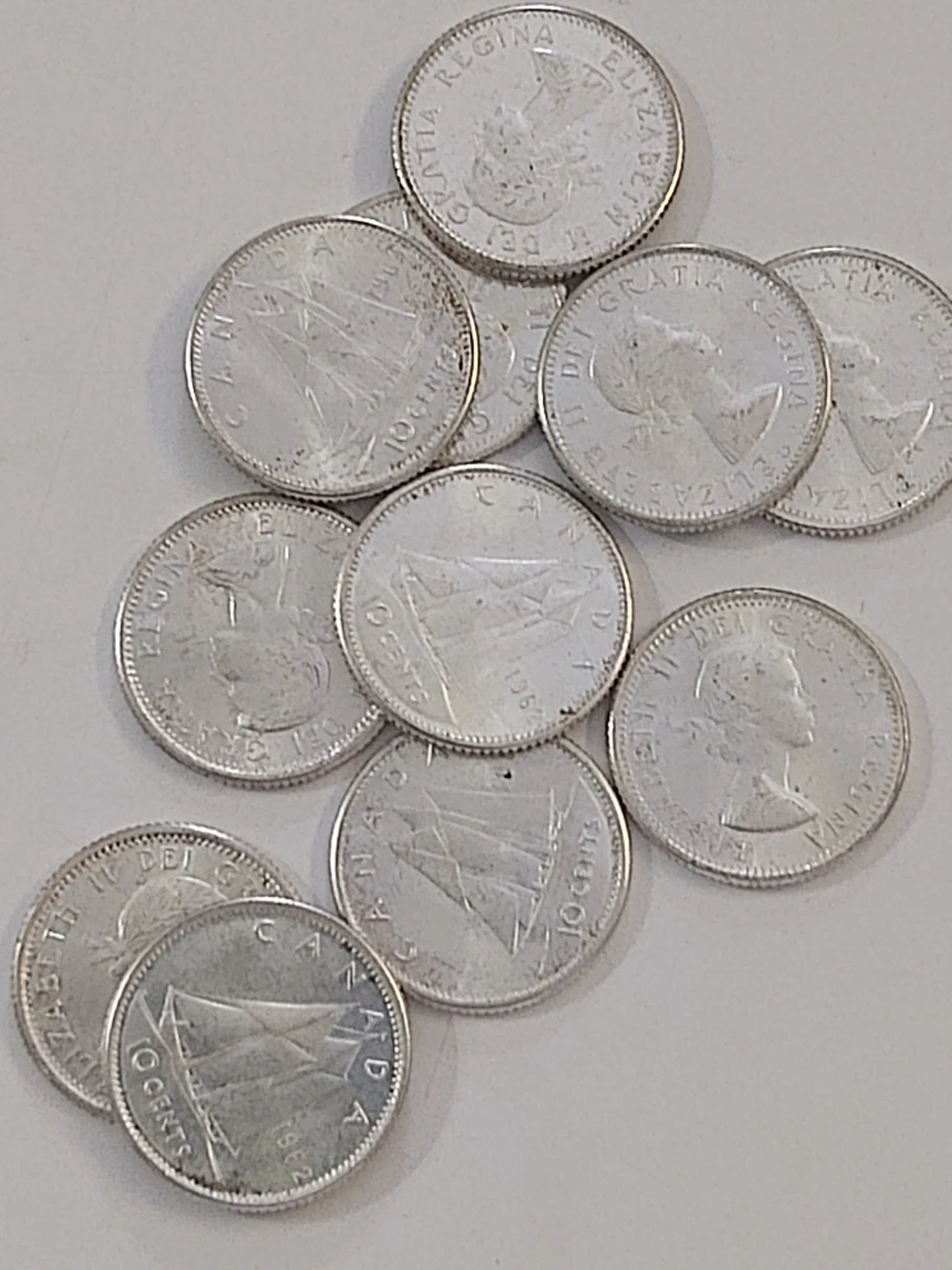 Selling a collection of vintage Canadian 10 cent coins. They feature a sailing ship on one side and Queen Elizabeth II on the other. A piece of Canadian history Collection, plus it's Silver content.