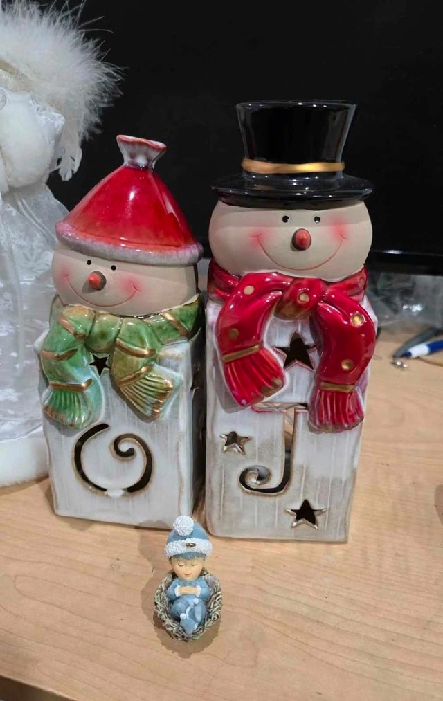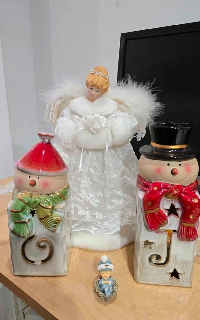 Selling a lovely set of 4 Christmas decorations. Great for adding a festive touch to your home! The bundle includes: 2 Ceramic Snowman Candle Holders: Super cute tea-light holders (one with a red hat, one with a black hat). They have star-shaped cutouts that glow when a candle is lit inside. 1 Angel Figurine: Beautiful standing angel with white feather wings, a faux-fur collar, and a snowflake-patterned dress. 1 Sleeping Baby Ornament: A small, detailed figurine of a baby in a nest/manger wearing a blue hat. All items are in excellent condition. Selling as a set. Pickup: 220 steels avenue west