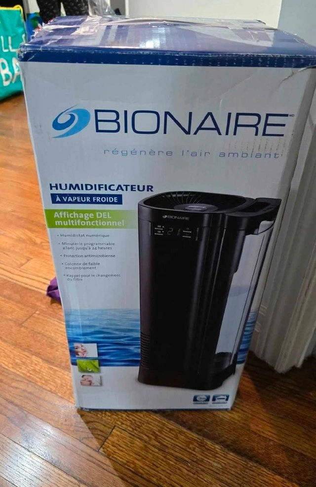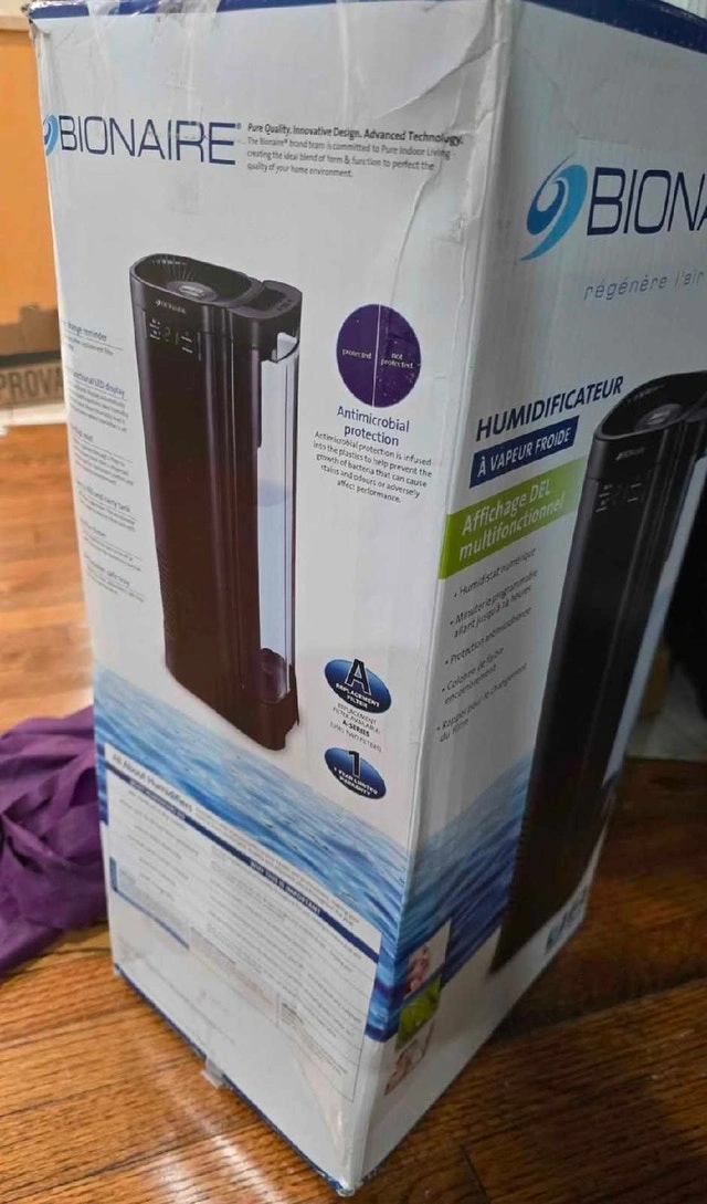 Keep your home comfortable during the dry months with this sleek Bionaire Cool Mist Tower Humidifier. Its space-saving vertical design fits perfectly in any room without taking up much floor space. Key Features: Digital Humidistat: Automatically monitors and maintains your preferred humidity level. Programmable Timer: Set it and forget it with up to 24-hour run time. Antimicrobial Protection: Infused with technology to prevent bacteria and mold growth. Easy Maintenance: Large, easy-to-fill water tank with a carry handle. Filter Change Indicator: Lets you know exactly when it's time to swap filters (Uses Filter A). Condition: Filter need to change. Location: Pick up at 220 Steeles Avenue West.