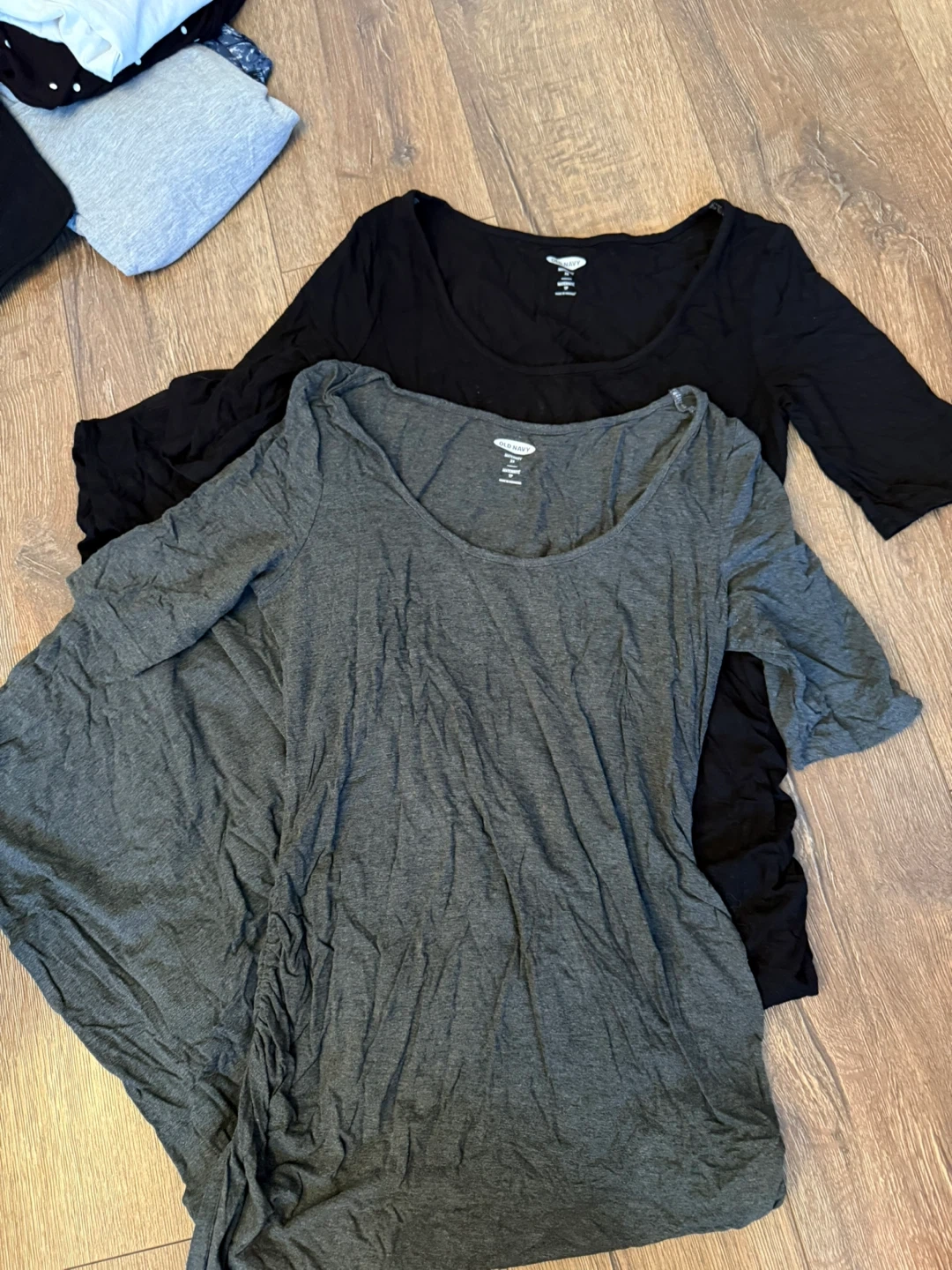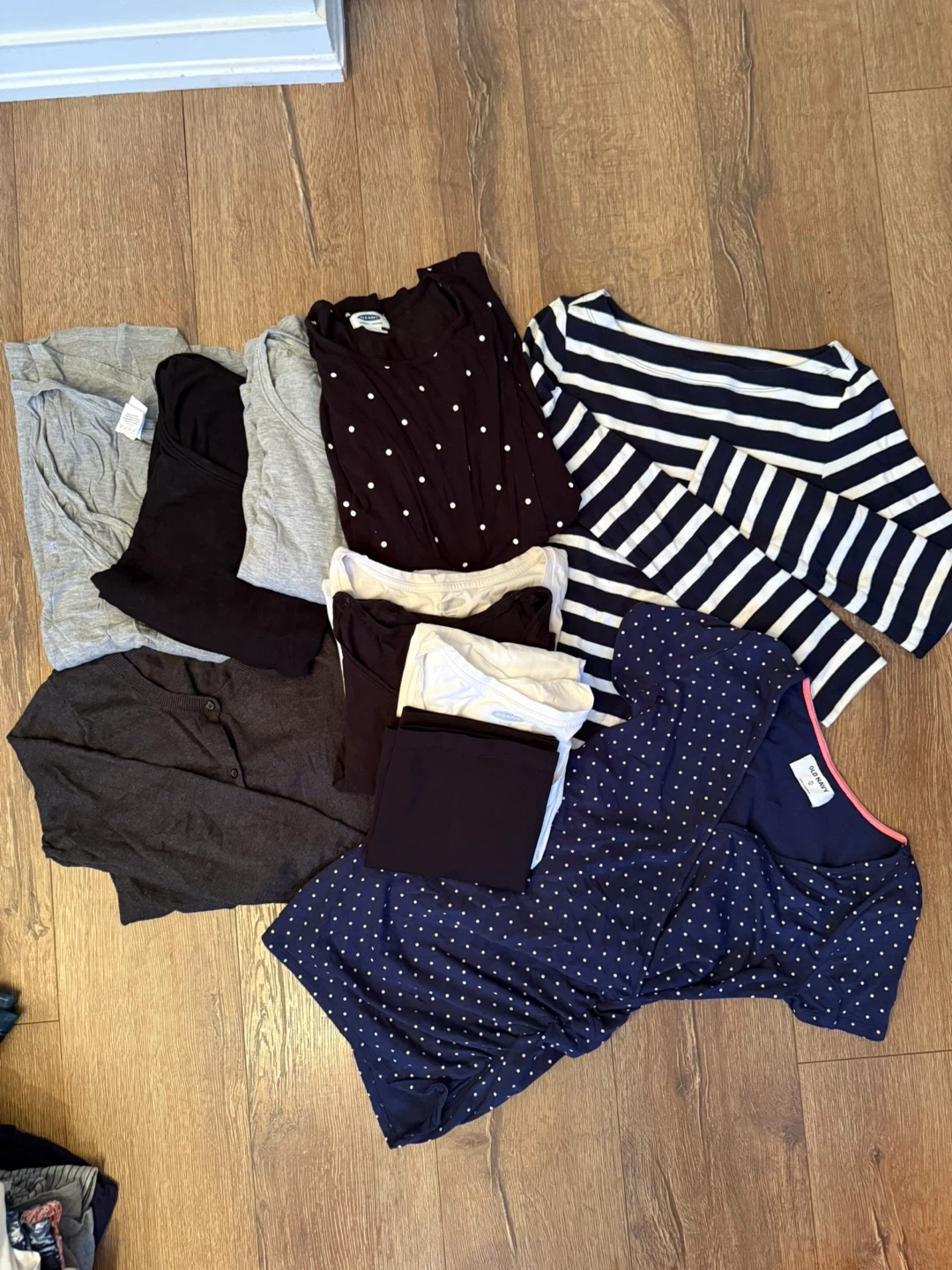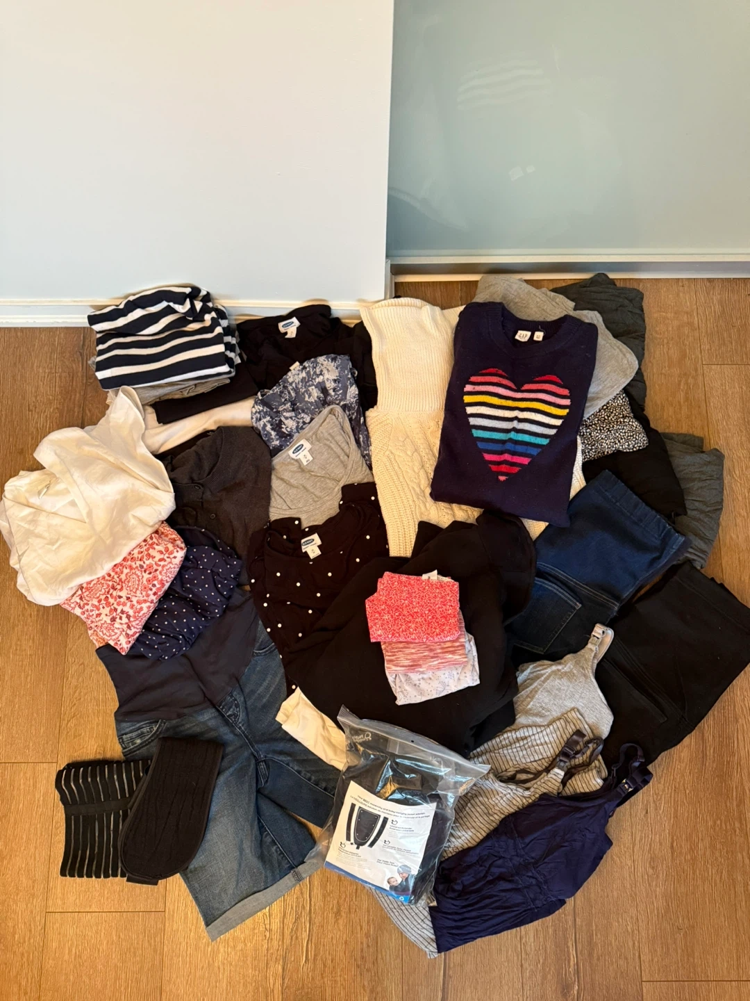 Selling a mixed lot of MATERNITY clothing, including items from Thyme, Old Navy, H&M and GAP! There's a variety of maternity shirts, blouses, sweaters, pants, shorts, and dresses in different colours. There are eight nursing tops and dresses. There is also a universal jacket extender (worth $130 + tax), two bathing suits and two belly bands. This bundle is perfect for building a capsule wardrobe or adding some new pieces to your closet.