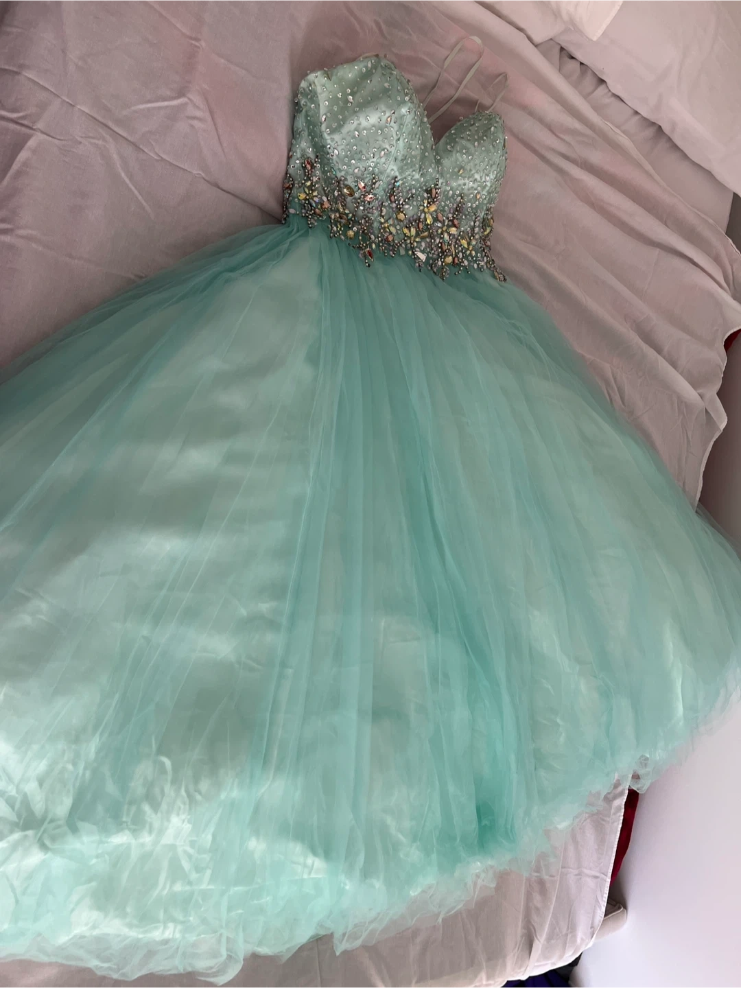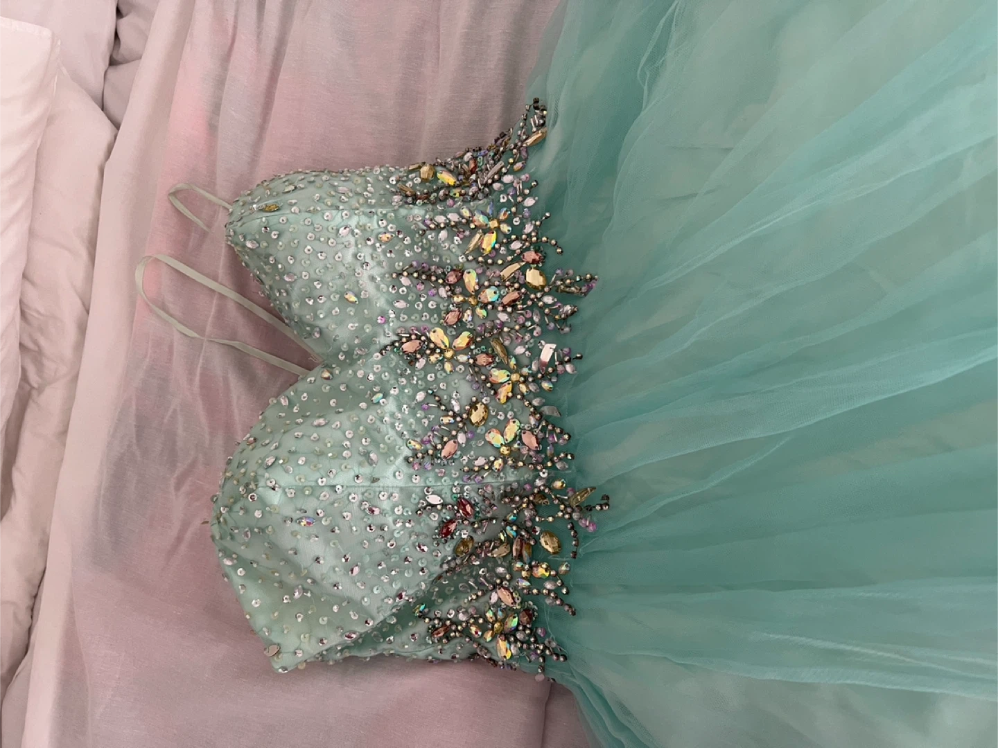 SWEET SIXTEEN….Selling a beautiful light green tulle prom dress! The bodice is adorned with colorful embellishments, making it perfect for a special occasion. It is in great condition and ready to make someone's night magical