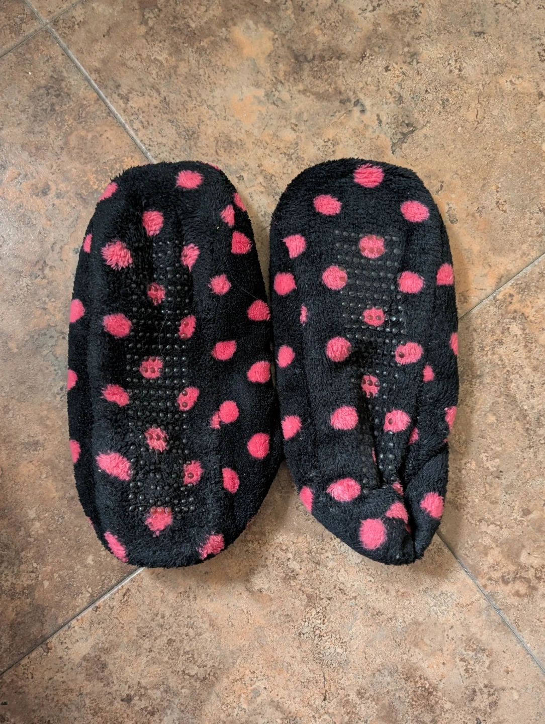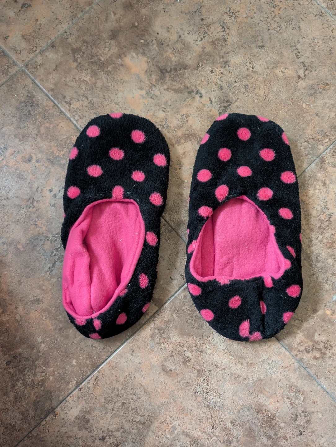 Cute and comfy slippers with a fun polka dot pattern! These slippers are black with pink polka dots and a soft pink interior. Perfect for keeping your feet warm and cozy around the house.
