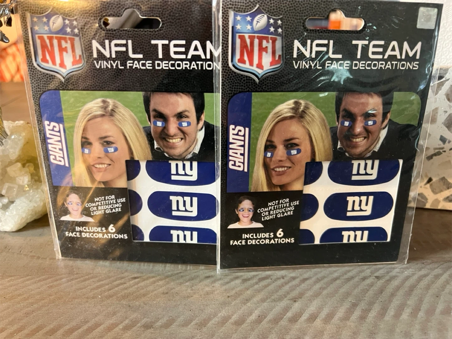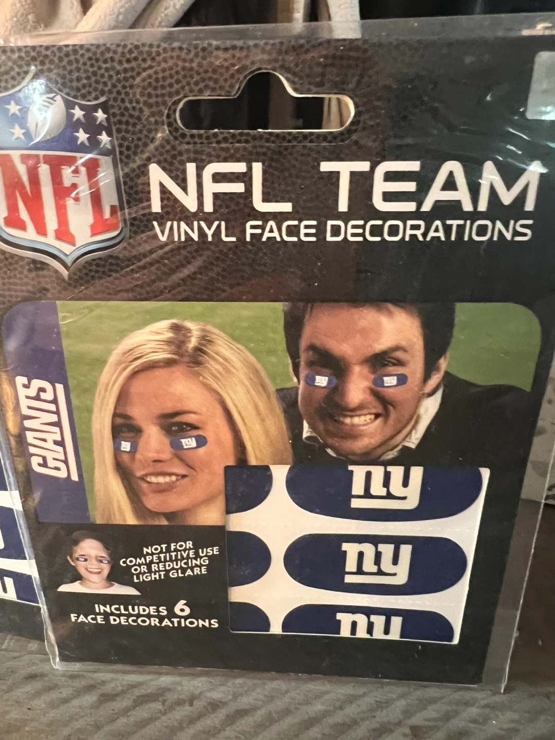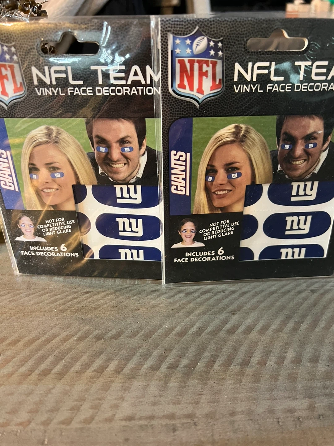 Get ready to show your team spirit with these New York Giants NFL face decorations! Each pack includes 12 vinyl face decorations that are easy to apply. Perfect for game day or any Giants event! Not for competitive use.