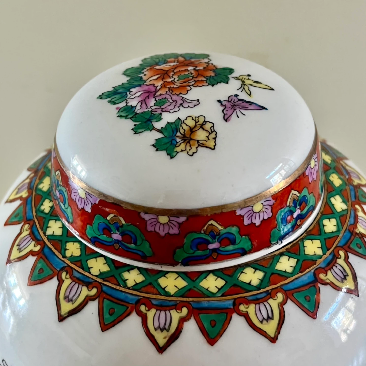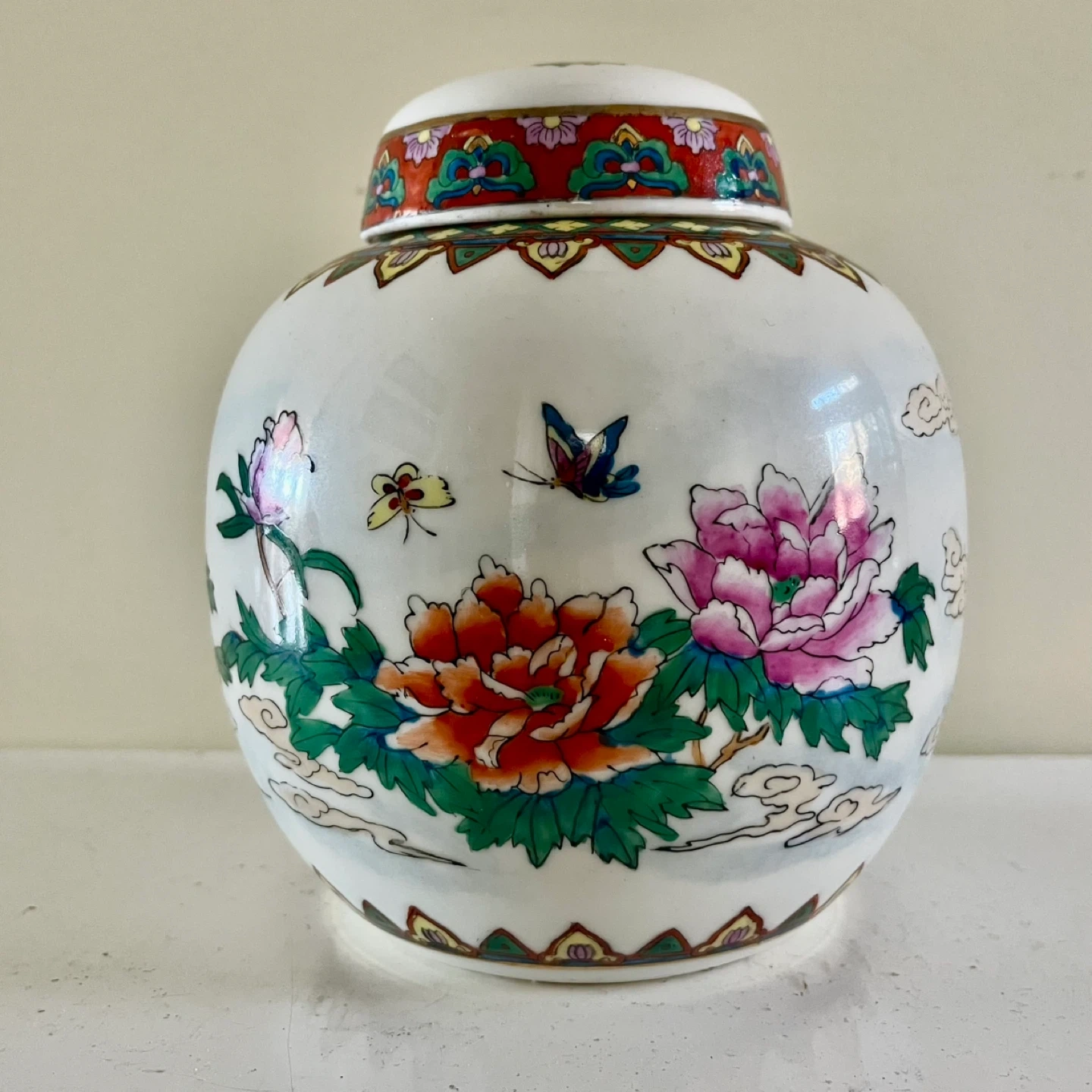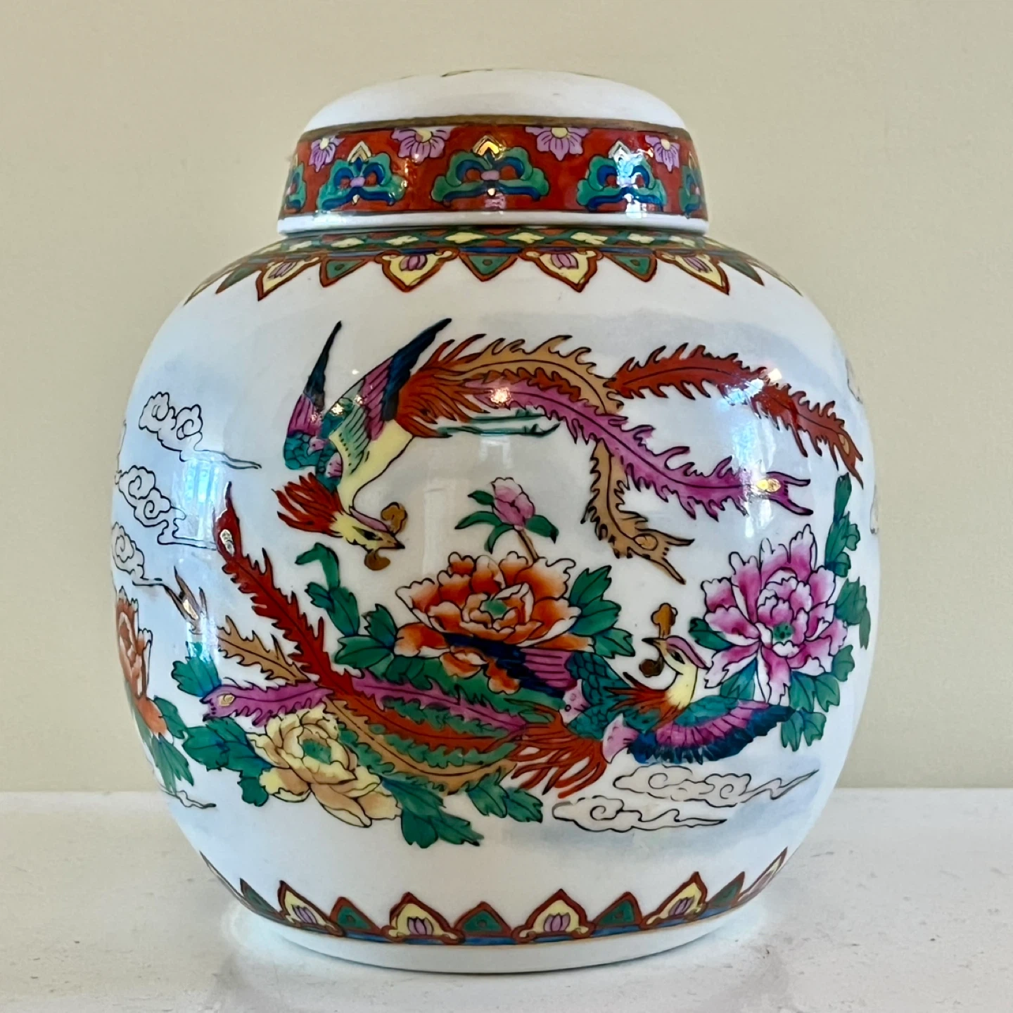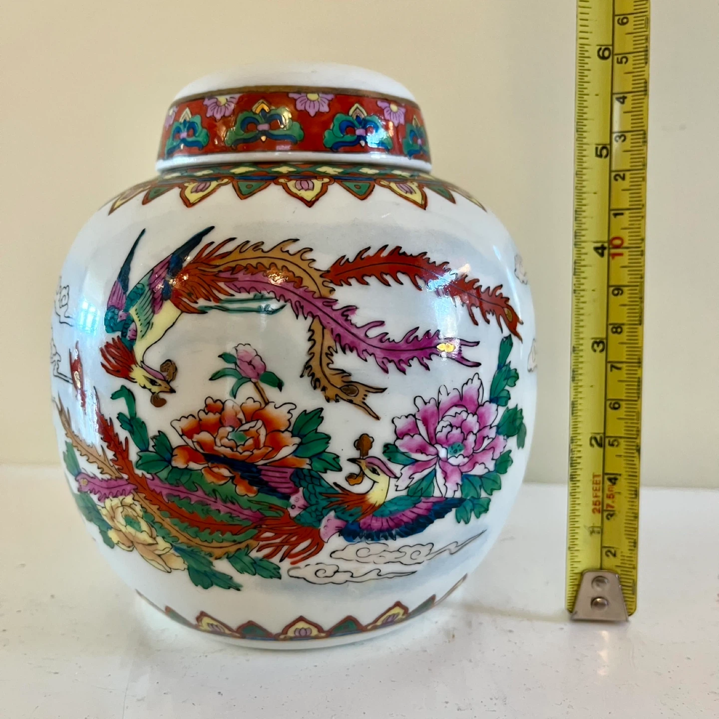 This vintage ginger jar is a beautiful decorative piece, featuring vibrant phoenix and floral designs on a white background. Made in China, it stands approximately 6 inches tall and is in good condition.