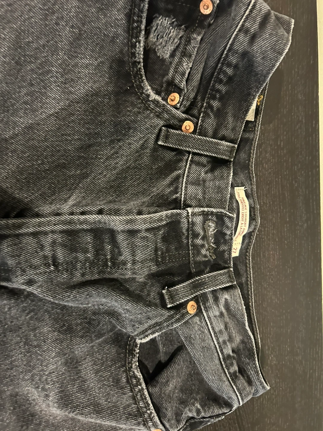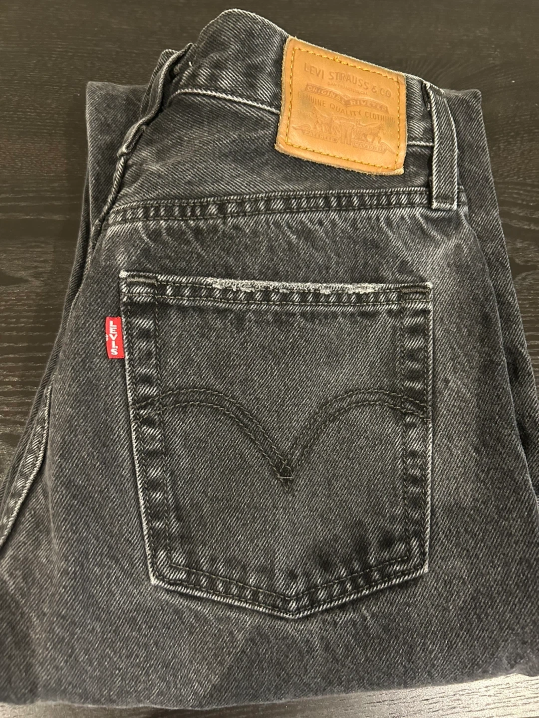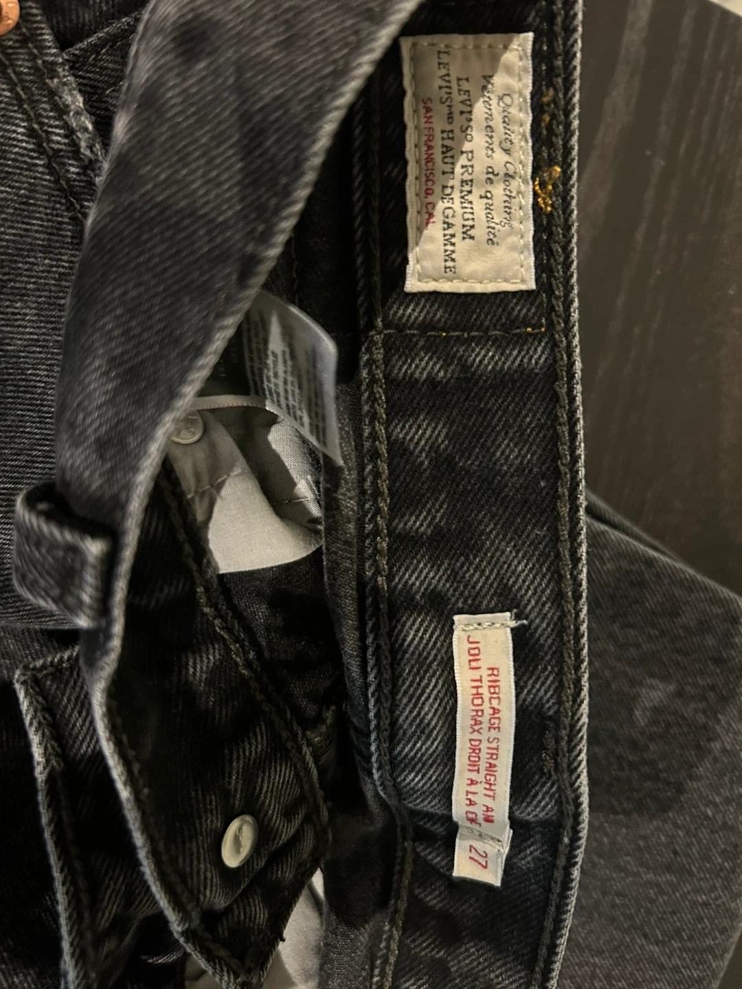 Levi's Ribcage Straight Ankle jeans in a stylish black wash! These are a size 27 and feature a trendy, straight-leg cut. They have some distressed detailing for a cool, worn-in look