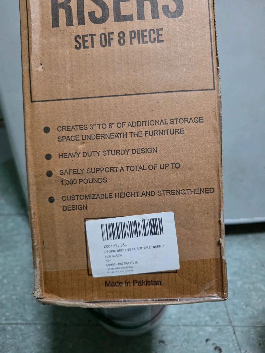 Lightly used adjustable furniture risers. These risers are black and can add 3" to 8" of additional storage space underneath your furniture. They have a heavy-duty sturdy design and can safely support a total of up to 1,300 pounds. The box is included!