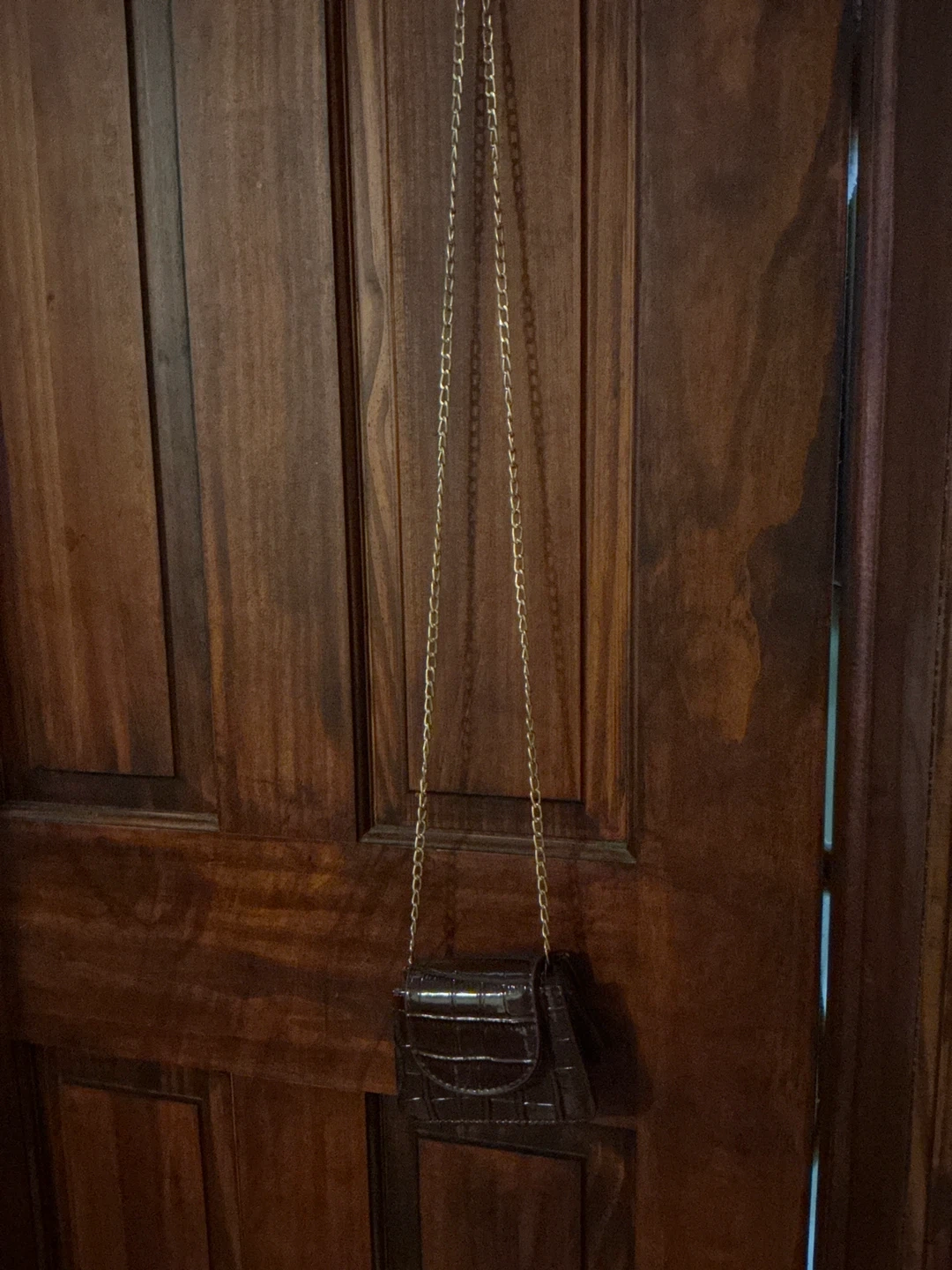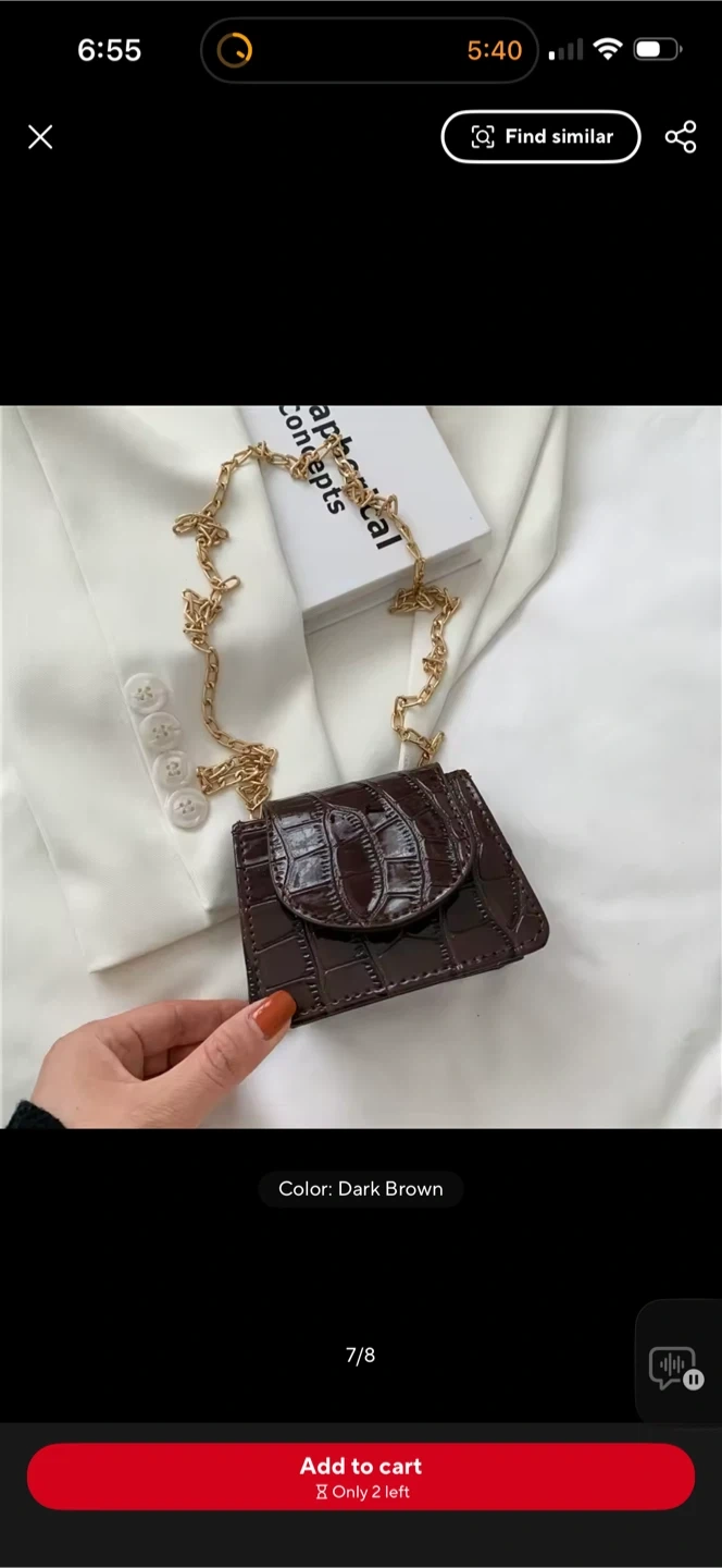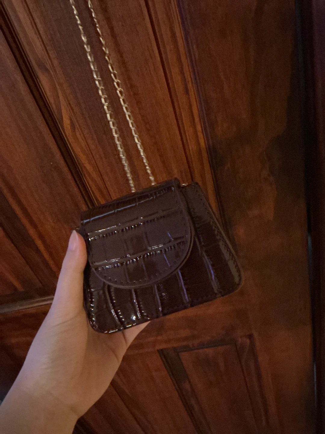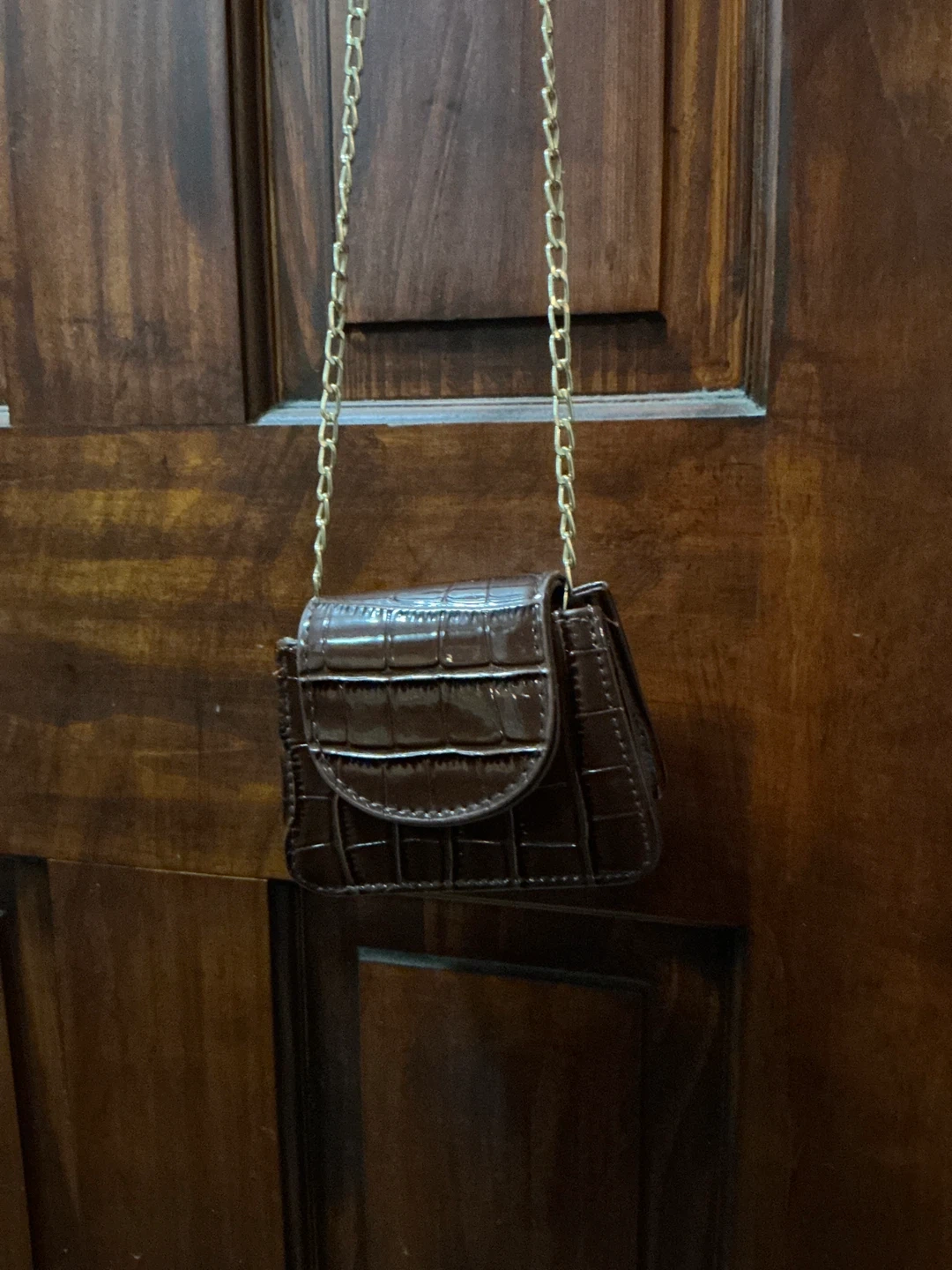 Selling a super cute mini bag! It's a dark brown color with a croc-embossed texture and a delicate gold chain strap. Perfect for carrying small essentials and adding a touch of style to any outfit