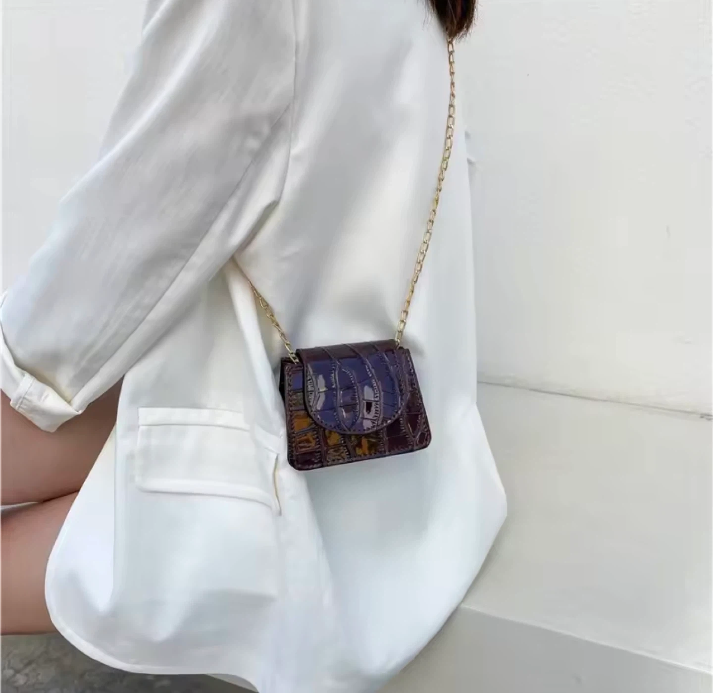 Brown Croc Embossed Mini Chain Bag