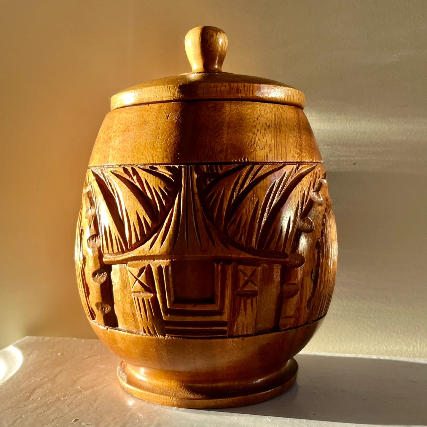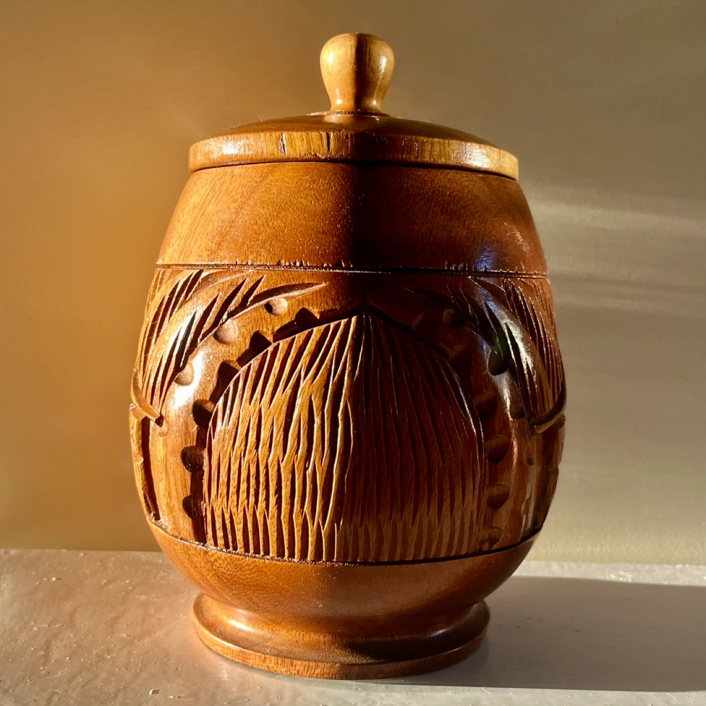 Mid-century Hawaiian ice bucket, made by Alii Woods of Honolulu, perfect for adding a touch of Aloha to your next gathering. Hand carved. Good vintage condition. 10” tall with lid.