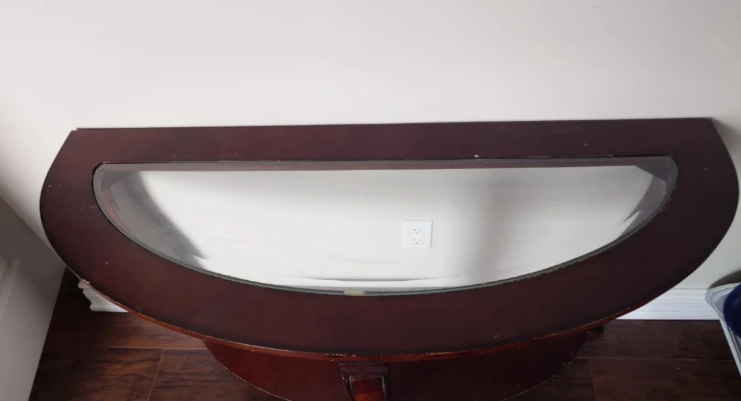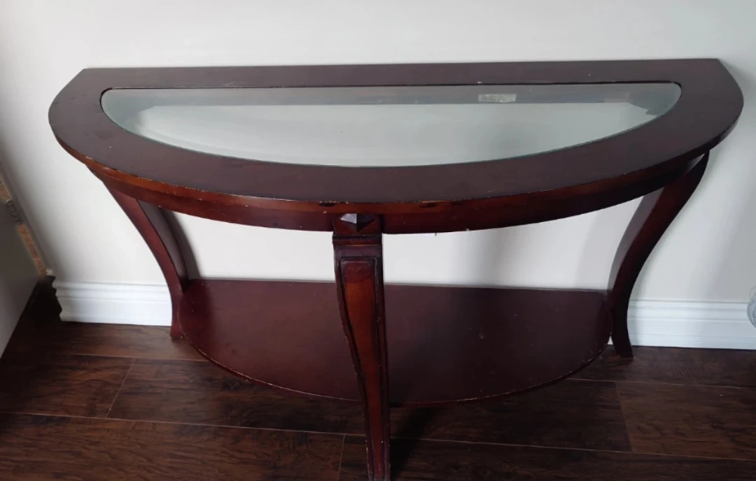 This console table, perfect for an entryway, hallway, or behind a sofa. It has a modern, minimalist look that fits any decor. The glass is thick and has no major chips or deep scratches.