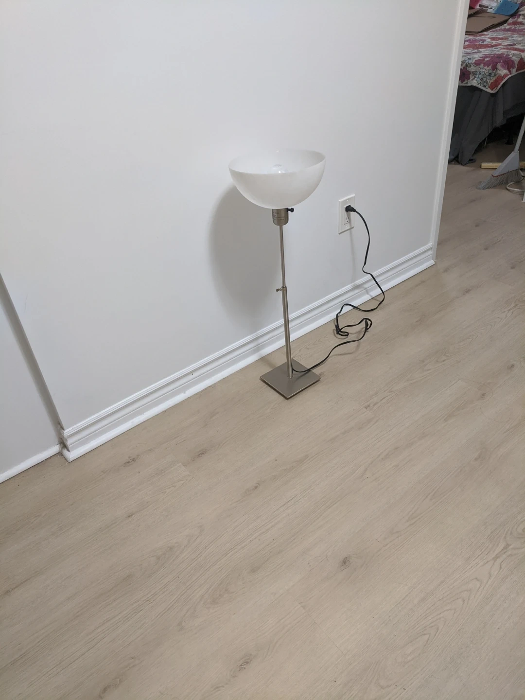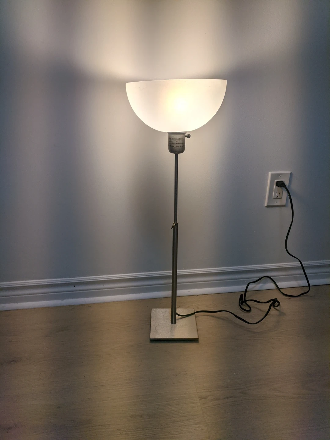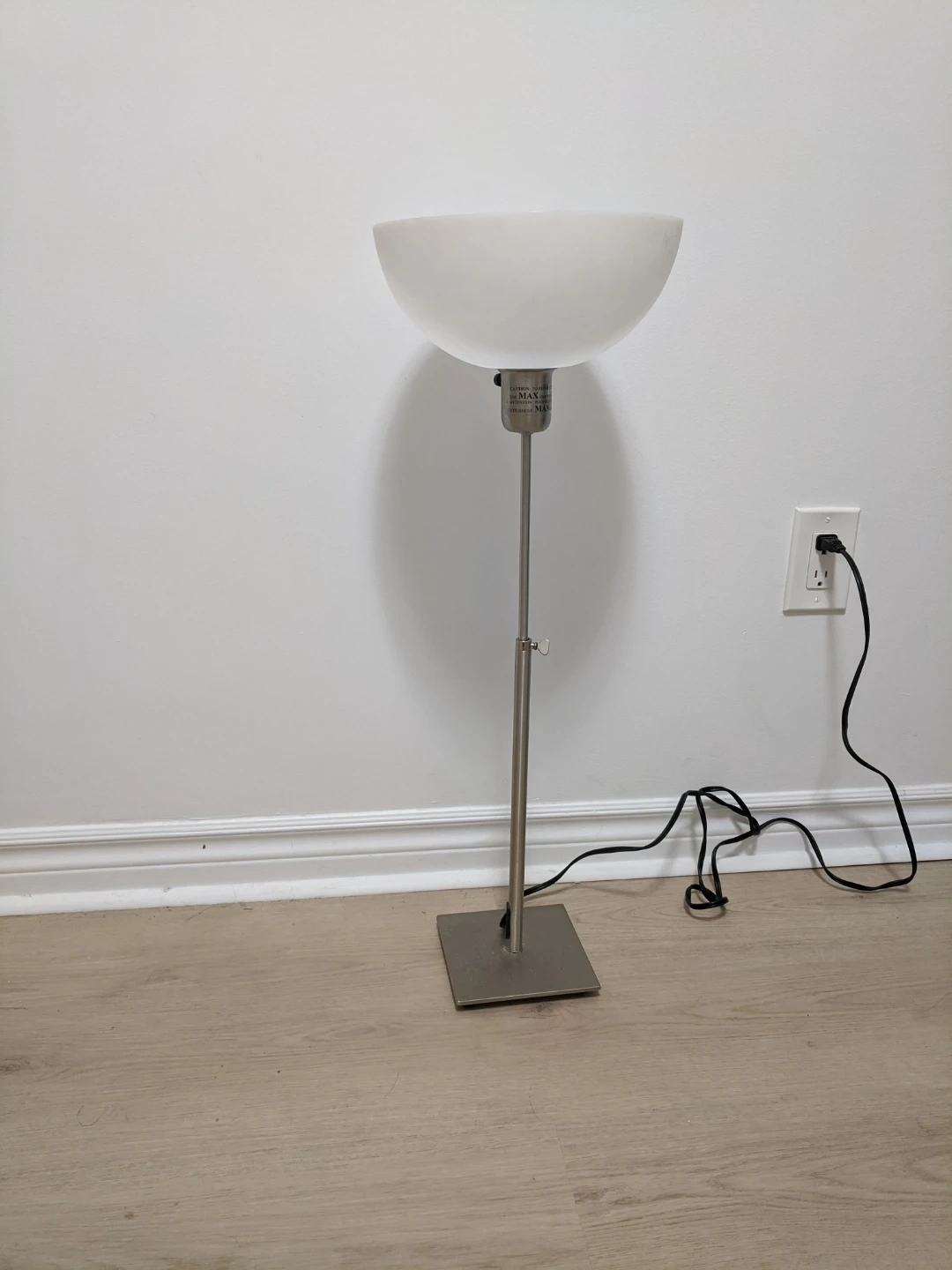 Selling a stylish torchiere tinny floor lamp. It has a minimalist design with a white shade and a brushed metal base. It's perfect for adding ambient lighting to any room in your home. Height:22"~29.5".