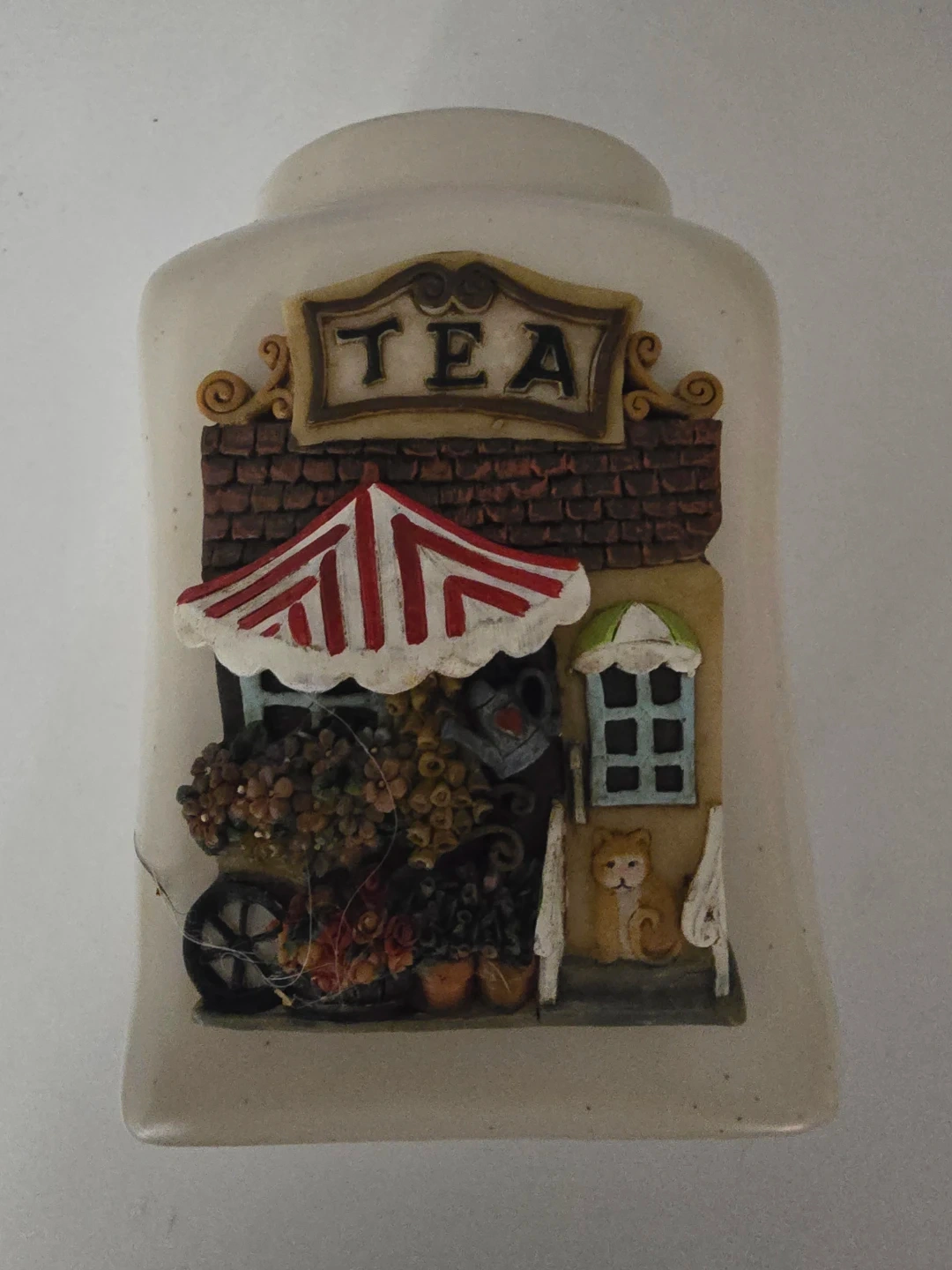 Selling a cute vintage tea canister! It features a charming design of a tea shop with a red and white striped awning and a little cat. Perfect for adding a touch of whimsy to your kitchen decor