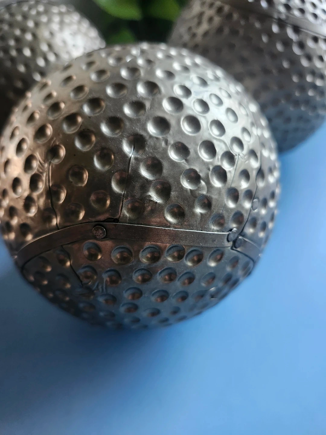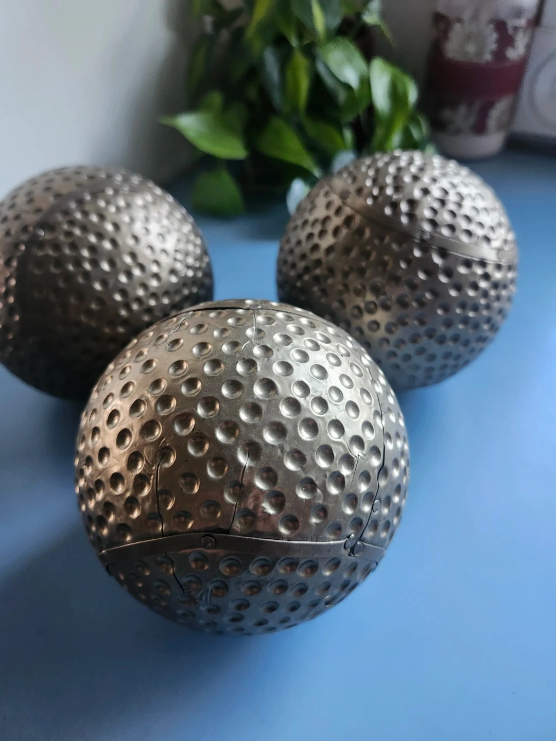 Selling a set of three decorative gold spheres. They have a hammered texture and would look great in any room! They are in great condition and ready to add some style to your home