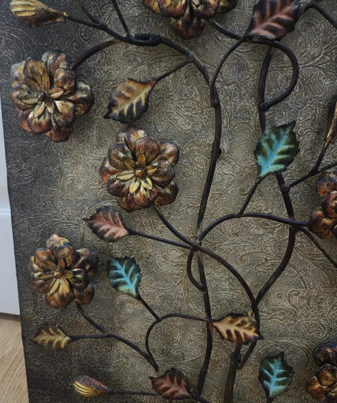 This is a beautiful piece of floral metal wall art. It has a brown and gold colour scheme with touches of blue and green on the leaves. It's in great condition and would look lovely in any room of the house