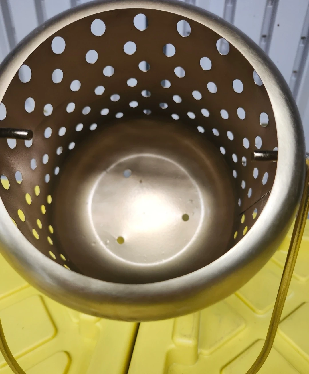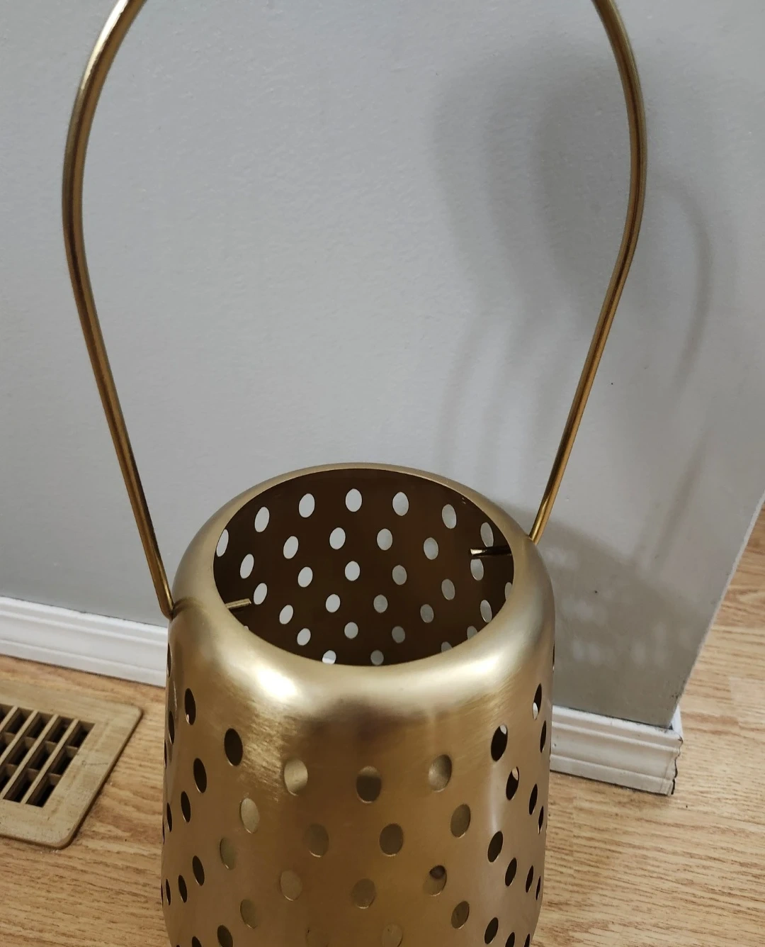 Here's a lovely new gold metal lantern with a handle. Would look great indoors or on a patio.
