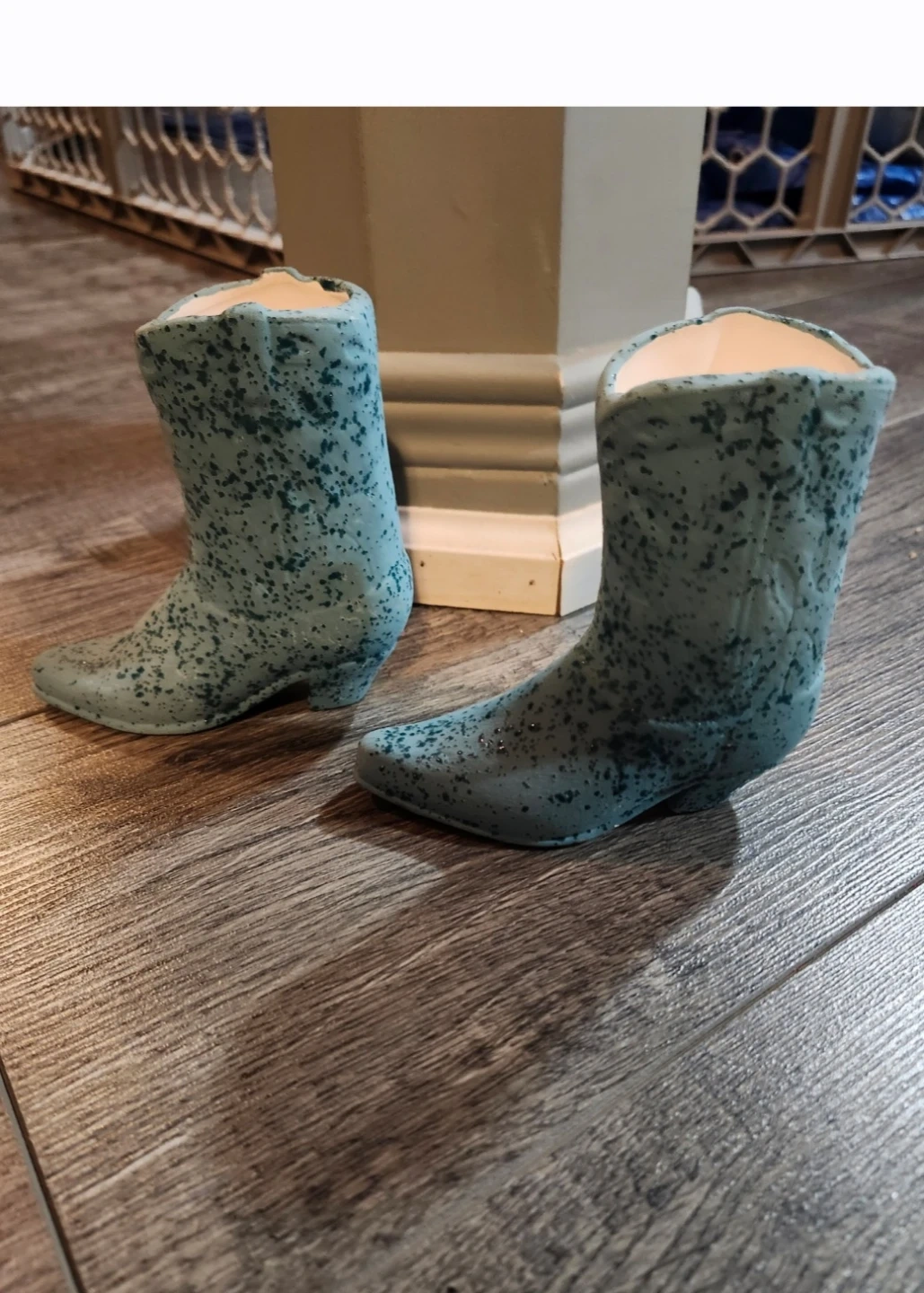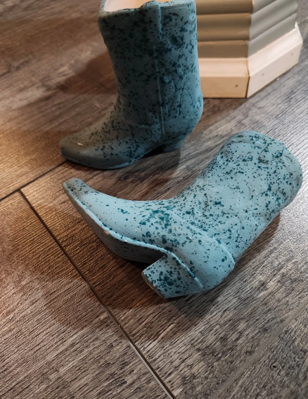 Here's a cute set of two cowboy boot planters! They have a unique, speckled design and are perfect for adding a touch of western charm to your home or garden