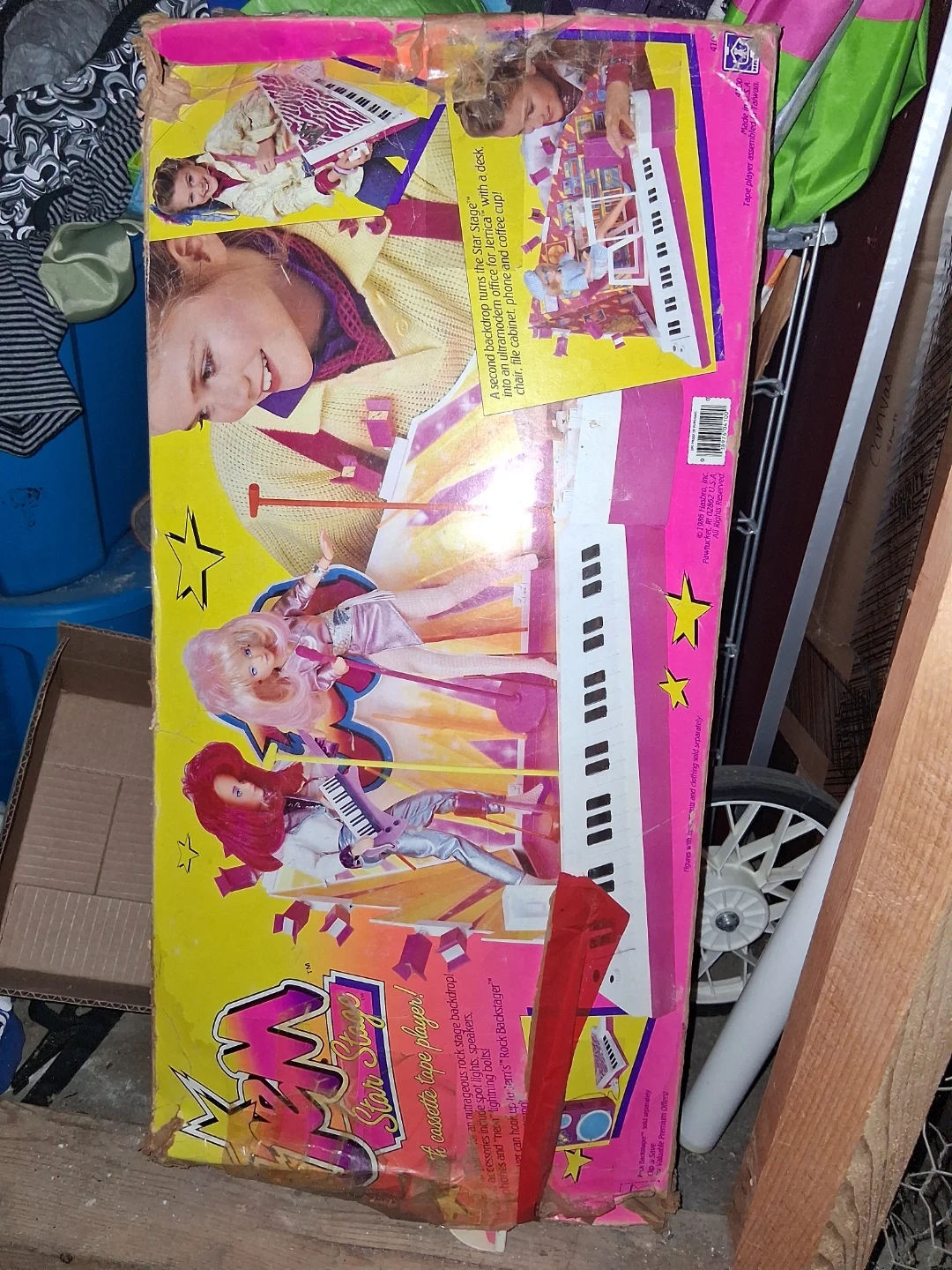 Selling a vintage 1986 Jem Star Stage cassette tape player! It comes with an outrageous rock stage backdrop. The accessories include spotlights, speakers, phones, and "new lightning bolts"! The box has some wear and tear, but it's still a super cool piece of Jem memorabilia