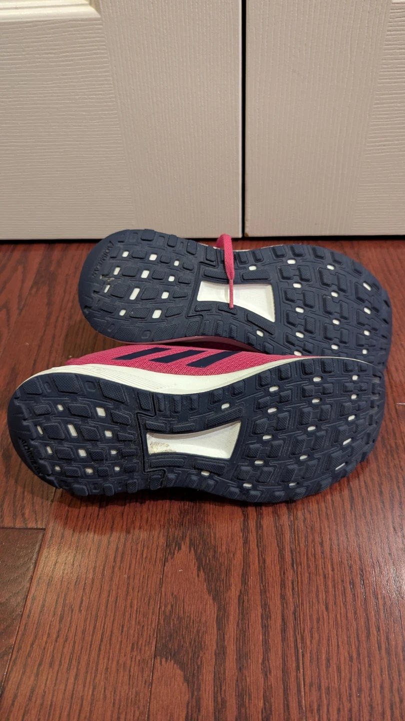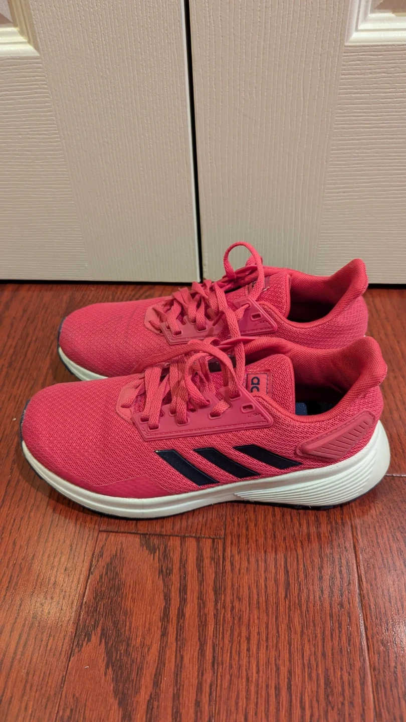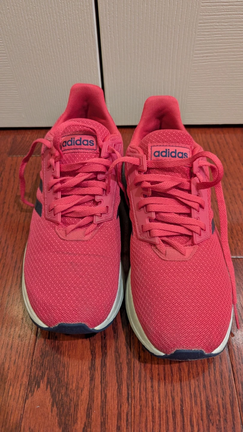 Selling a pair of Adidas running shoes in a vibrant pink colour! They're in great shape and ready for your next run or casual outing. The shoes feature the classic Adidas three-stripe design. Perfect for adding a pop of colour to your athletic wear
