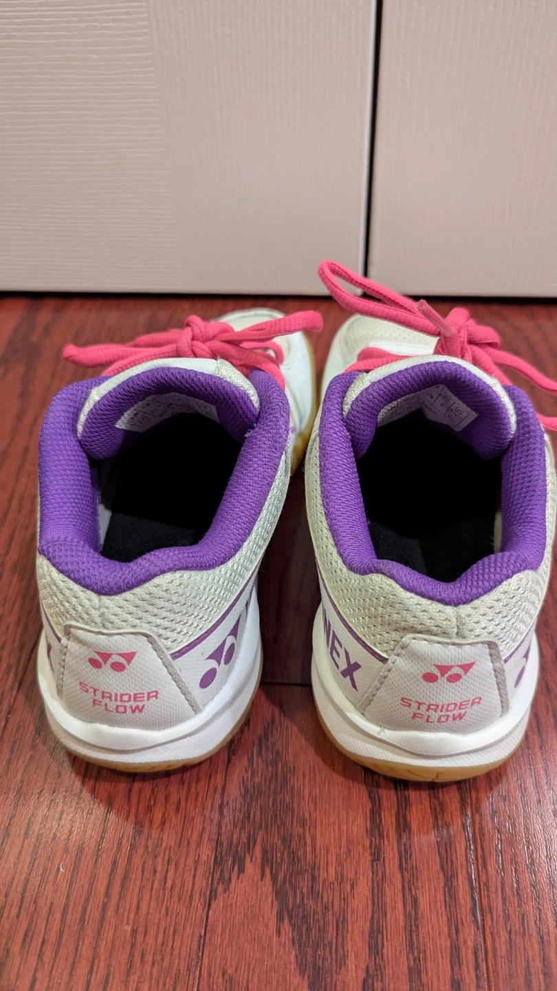Here are a pair of Yonex Strider Flow badminton shoes! They are white with purple and pink accents. Great for playing badminton or other indoor sports
