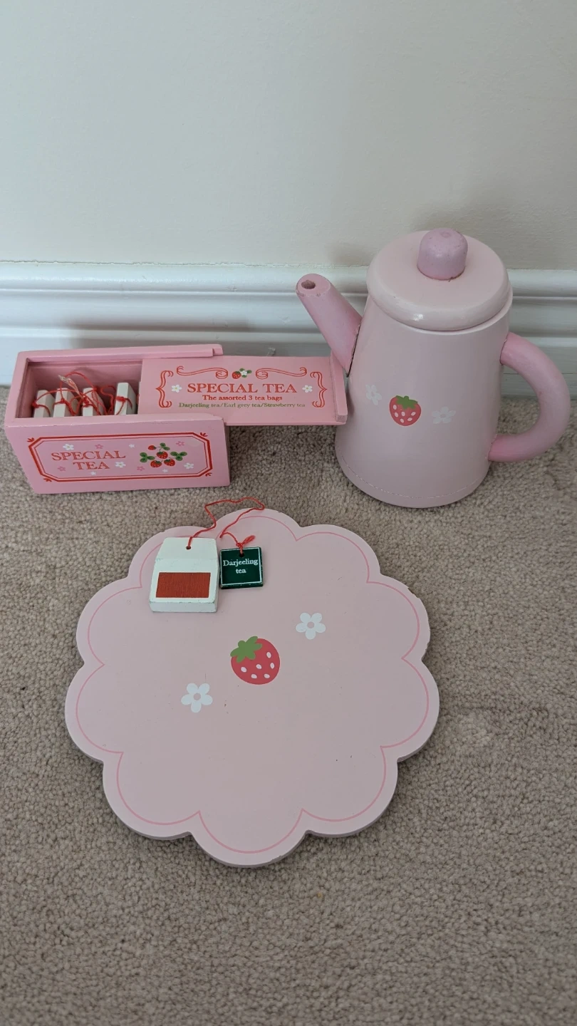 A cute pink wooden tea set for kids! It includes a teapot, a tea bag box with tea bags, and a coaster. Perfect for pretend play and tea parties