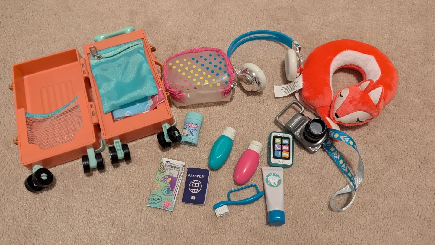 Selling a cute doll travel set! Includes a suitcase, headphones, a fox-shaped travel pillow, a camera, a phone, toiletries, and a passport. Perfect for your doll's next adventure!