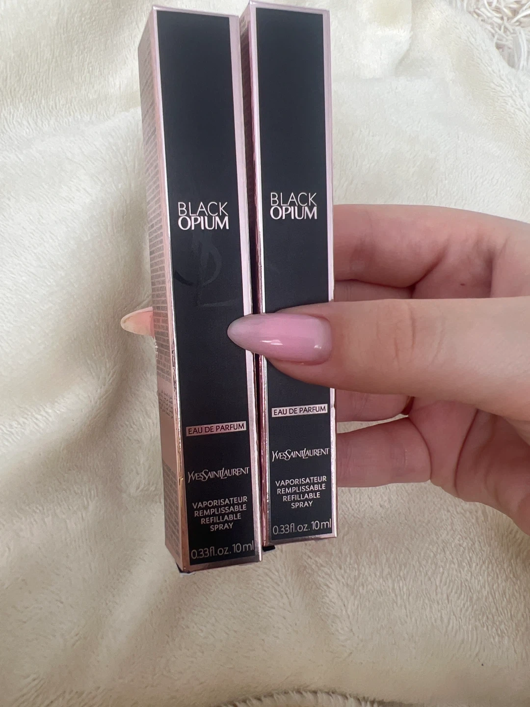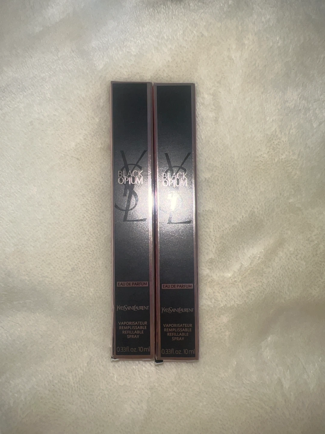Selling two brand new Yves Saint Laurent Black Opium Eau de Parfum, each containing 10ml. It's a vaporisateur remplissable refillable spray. A great size to keep in your purse!