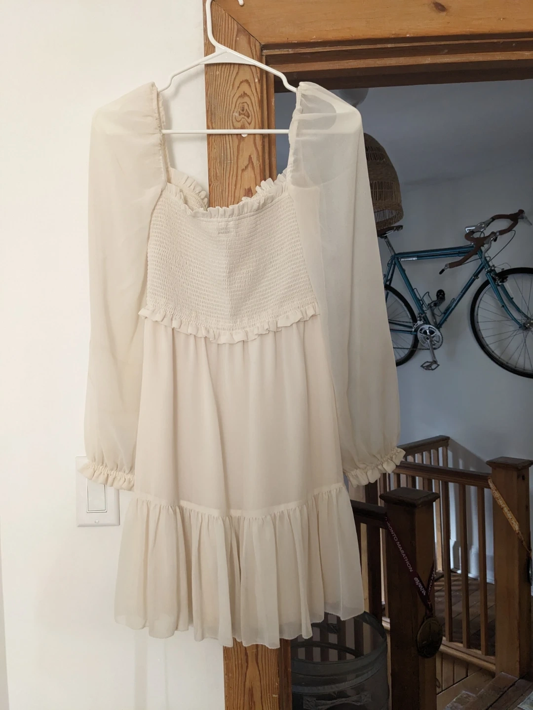 Aritzia/Wilfred's iconic tempest dress in Birch (light cream). It has long sleeves and a flowy, tiered skirt. Worn once for an event, size small.