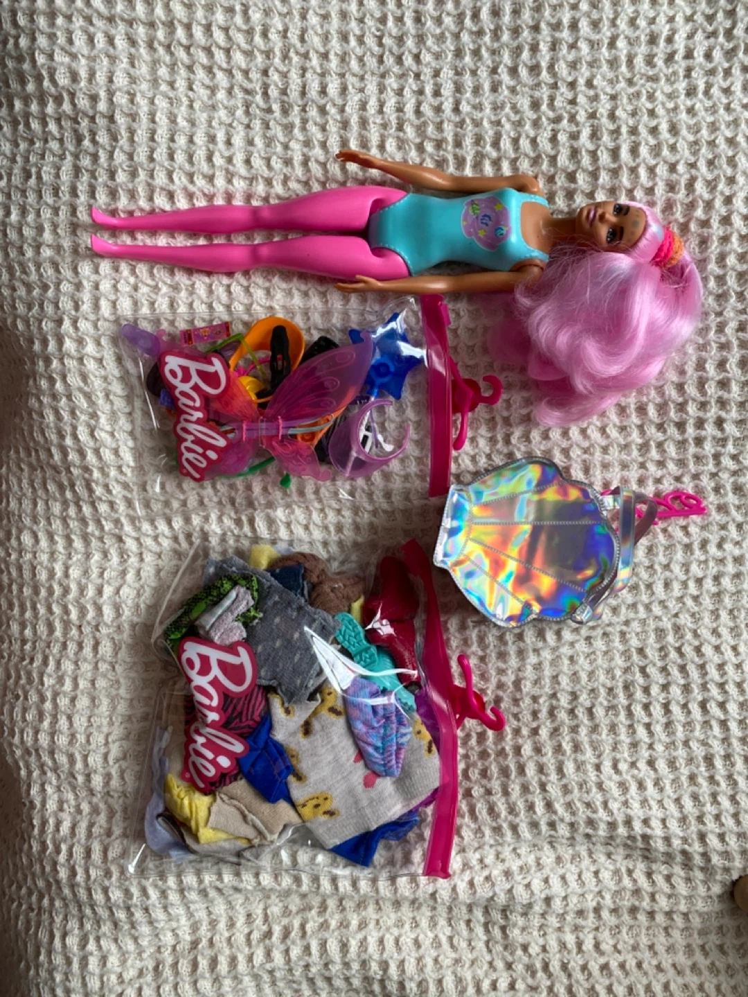 Selling a Barbie doll with pink hair, a blue swimsuit, and lots of extra clothes and accessories! There are two bags full of outfits, plus wings and a fun iridescent purse. Perfect for any Barbie fan!