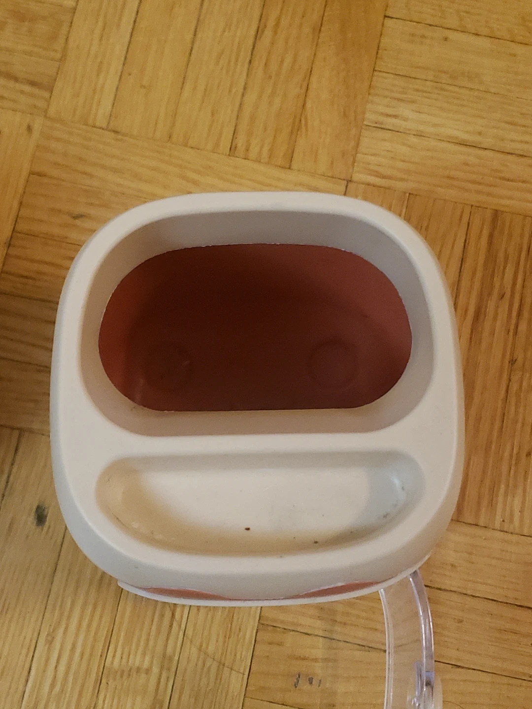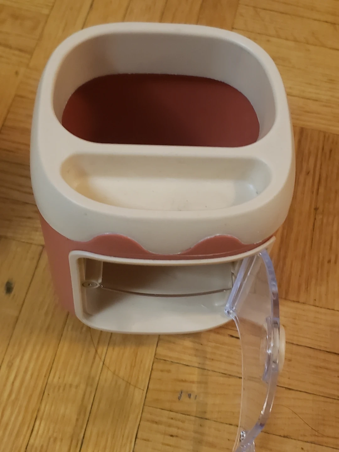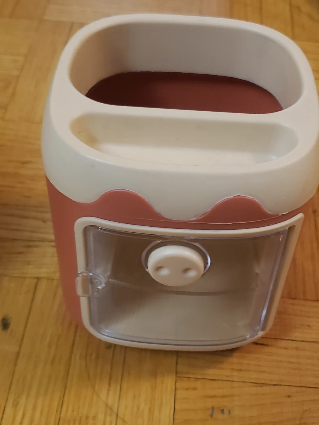 This is a super cute storage organizer! It's pink and white, with a little piggy nose on the door. Perfect for storing small items on your desk or vanity