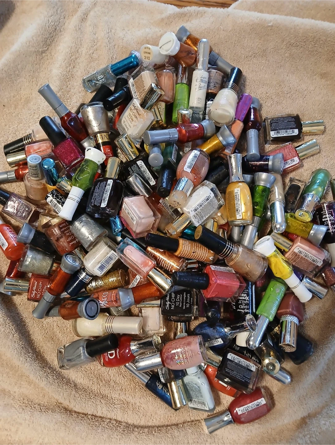 A big collection of nail polish bottles! You'll find a variety of colours and brands, including Sally Hansen. Perfect for anyone who loves doing their nails at home! 3 for $1!