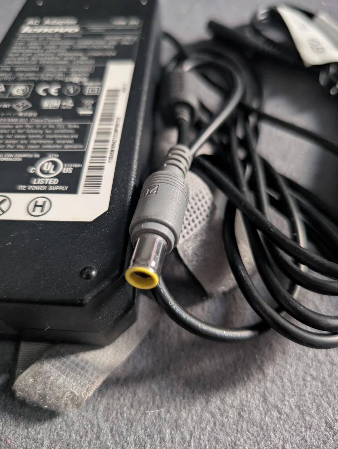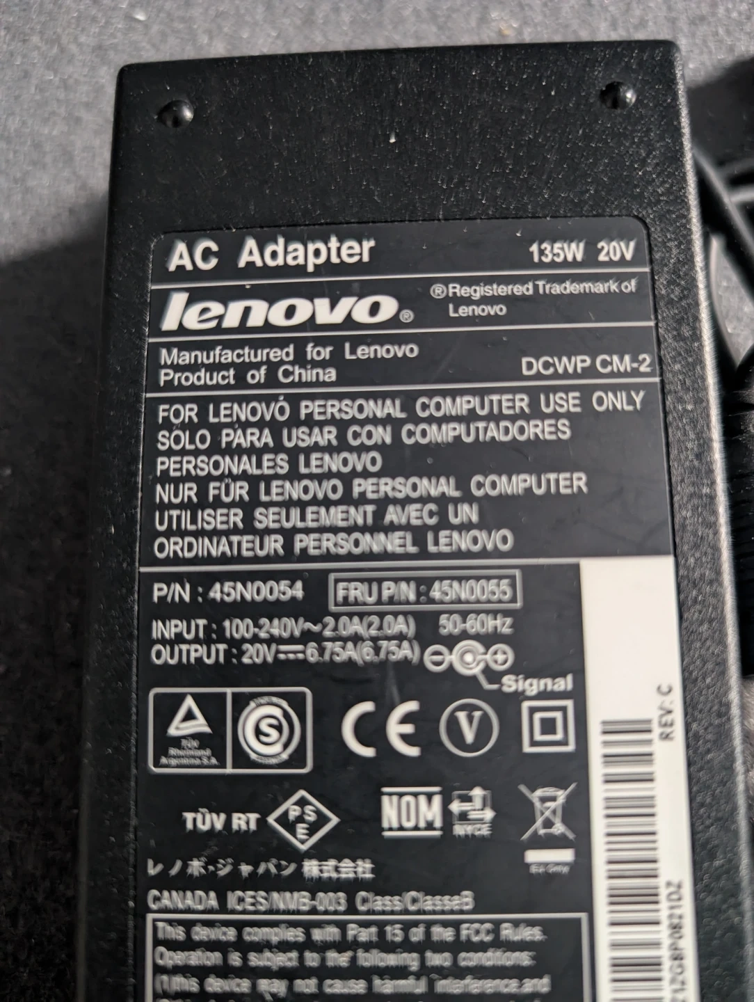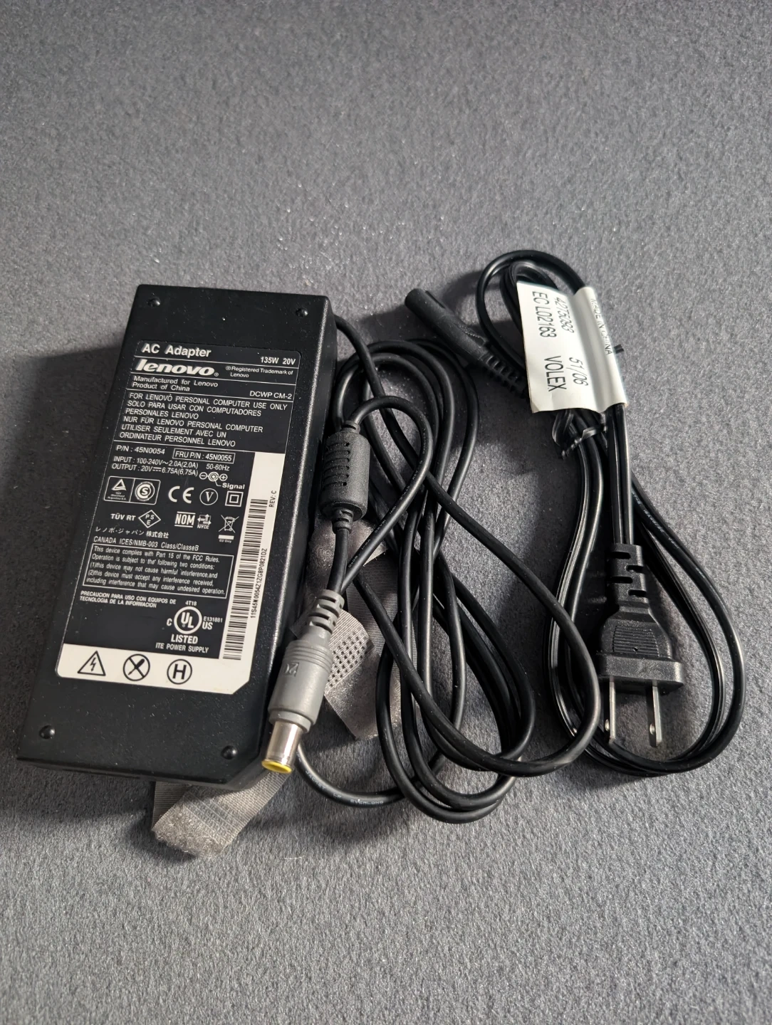 Selling a Lenovo 135W AC adapter, model number 45N0054. This adapter is designed for high-performance Lenovo laptops and Tiny workstations. It features a barrel-type connector with a yellow tip, commonly used on older ThinkPad W and T series laptops.