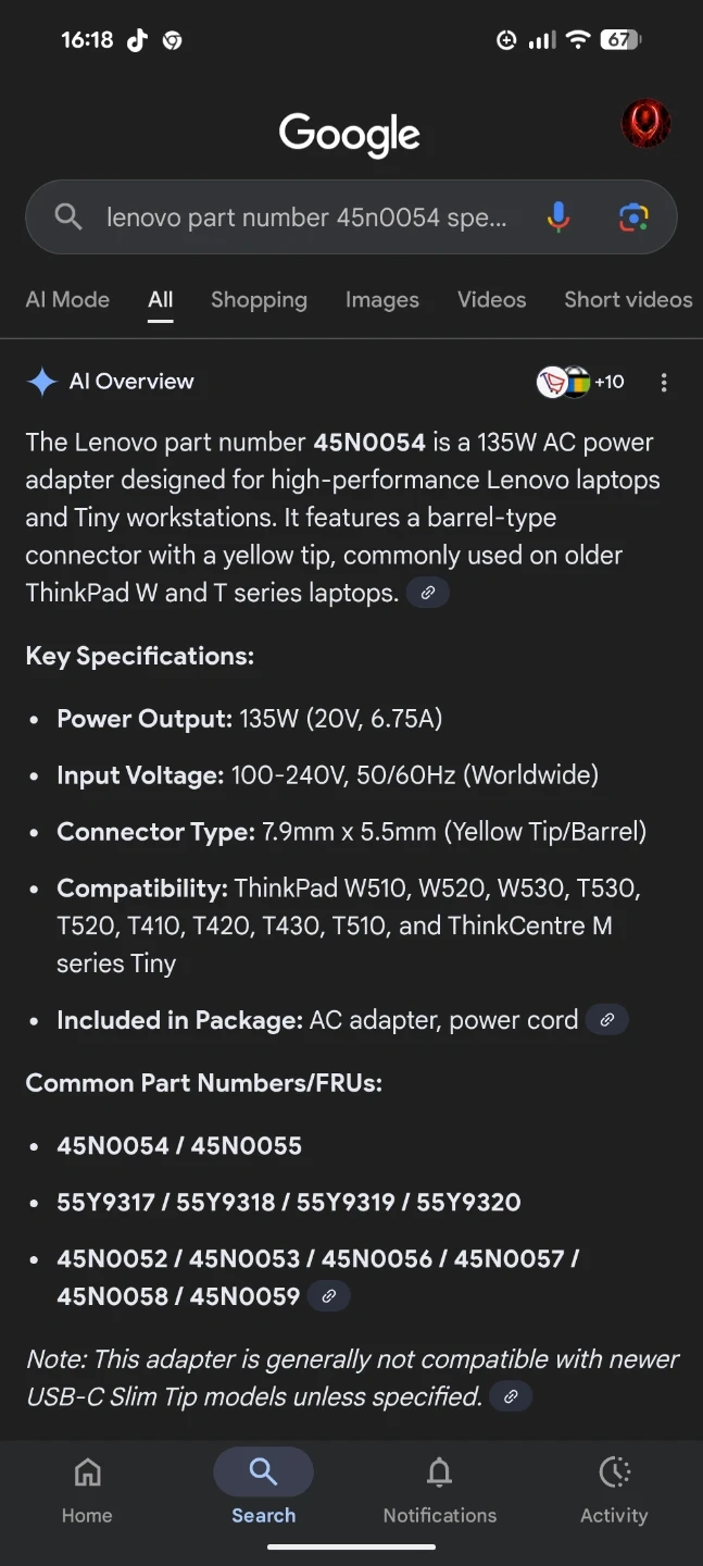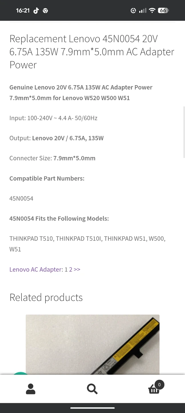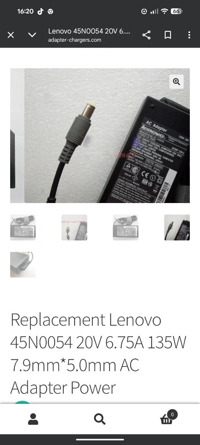 Selling a Lenovo 135W AC adapter, model number 45N0054. This adapter is designed for high-performance Lenovo laptops and Tiny workstations. It features a barrel-type connector with a yellow tip, commonly used on older ThinkPad W and T series laptops.