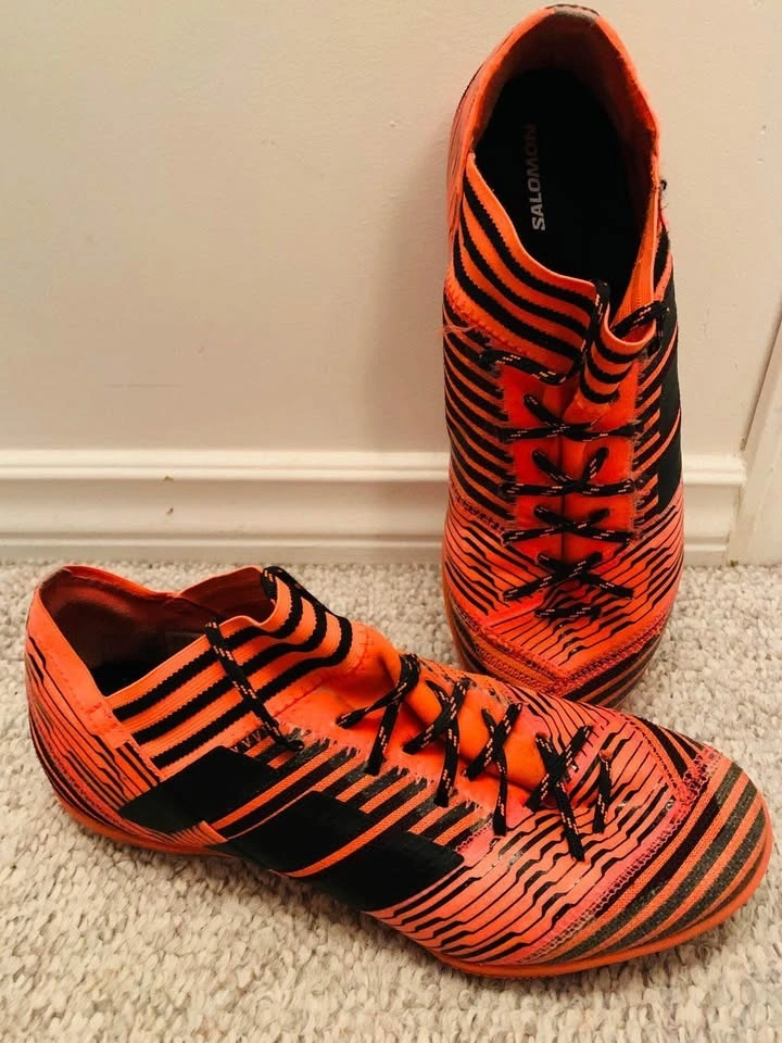 Orange and black Adidas Nemesis indoor soccer shoes, Men's size 7.
