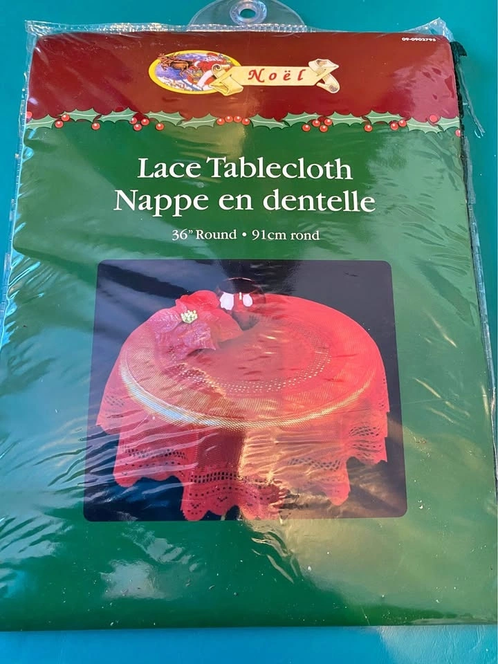 18 - New Dark Green Tablecloth, 36 inches round. Still in original packaging with 'Noël' branding. Has intricate lace details.